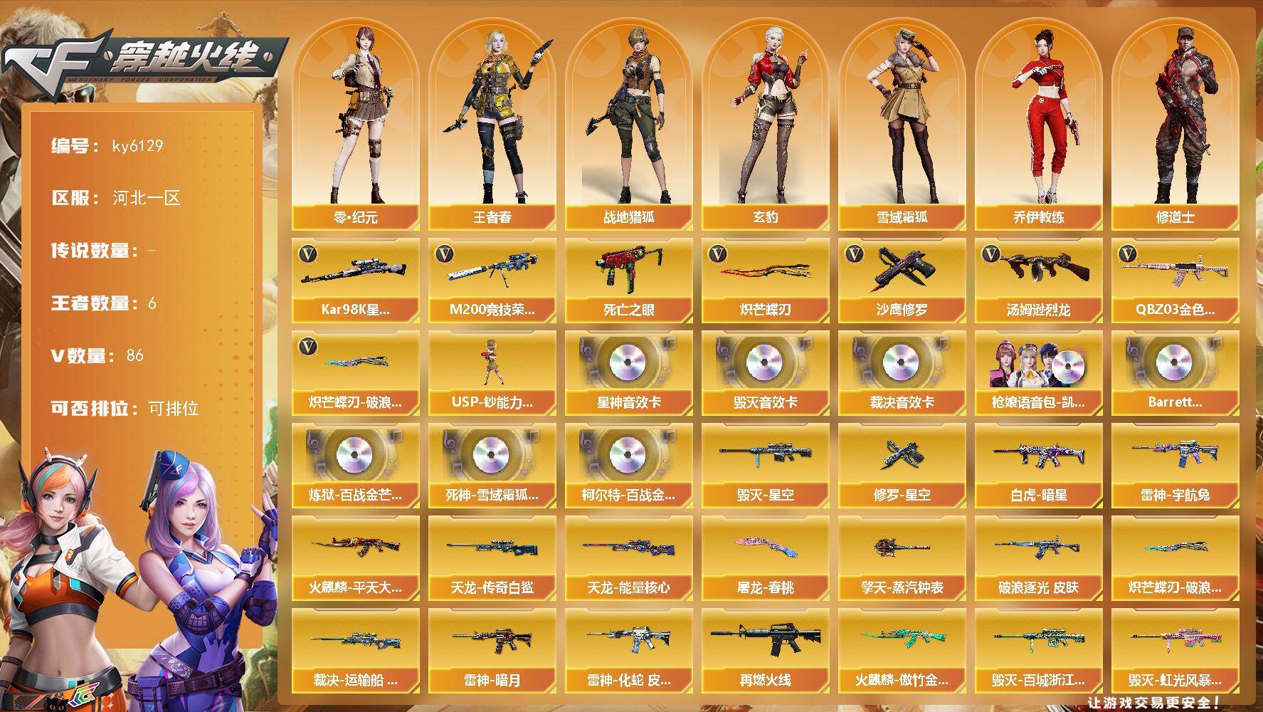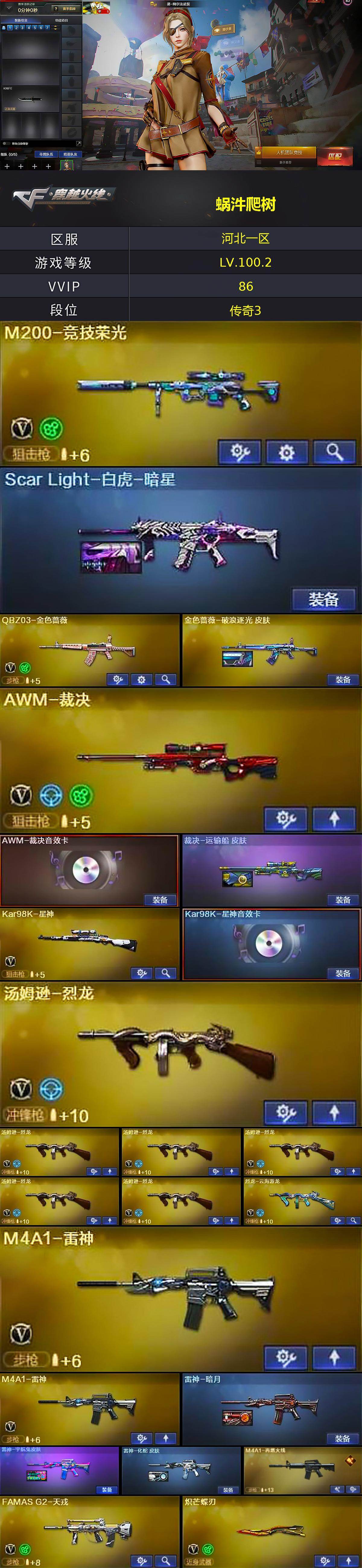 [17327625]河北一区-95V-6王者武器数-0炫金武器数 【热门武器】:QBZ03-金色蔷薇,M200-竞技荣光,死亡之眼,Kar98K-星神,汤姆逊-烈龙*6,USP-钞能力灵狐,沙鹰-修罗*3,炽芒蝶刃,炽芒蝶刃-破浪逐光 皮肤 【音效卡】:Barrett-毁灭音效卡,AWM-裁决音效卡,枪娘语音包-凯萨林,Kar98K-星神音效卡,Barrett-碧霄极光音效卡,炼狱-百战金芒-庆典舞曲音效卡,死神-雪域霜狐-怀旧音效卡,柯尔特-百战金芒-庆典舞曲音效卡 【皮肤】:幻神-电竞之星 皮肤,Scar Light-白虎-暗星,金色蔷薇-破浪逐光 皮肤,裁决-运输船 皮肤,裁决-胜者为王 皮肤,雷神-暗月,雷神-宇航兔皮肤,雷神-化蛇 皮肤,M4A1-再燃火线,火麒麟-平天大圣,火麒麟-傲竹金蛇 皮肤,毁灭-星空,毁灭-百城浙江 皮肤,毁灭-虹光风暴 皮肤,毁灭-英雄计划 皮肤,黑龙-暗月,无影-能量核心,天龙-能量核心,AWM-天龙-传奇白鲨,修罗-能量核心*2,修罗-星空,屠龙-春桃 皮肤,屠龙-破浪逐光 皮肤,屠龙-惊鸿 皮肤,龙啸-蛇姬 皮肤,轻型军用手斧-再燃火线,龙啸-青青莓果 皮肤,擎天-蒸汽钟表 皮肤,麒麟刺-萌杀皮肤,炽芒蝶刃-破浪逐光 皮肤 【角色】:玄豹,零·纪元,战地猎狐,王者春,雪域霜狐,乔伊教练,修道士,云海玲珑,葵-阿尔法武装,暗夜-X,北极狐-X,电竞少女,芳心审判者,娟娟,兰妹妹,0号玩家,灵狐者-X,龙儿,曼陀罗-X,潘多拉-甜心教官,潜龙队-X,蛇姬,斯沃特-X,兔囡囡,维纳斯,新娜塔莎,雪莉杨-摸金校尉,夜玫瑰-宠粉,影武者-X 【人偶武器】:USP-钞能力灵狐,迷你生化手雷,迷你艾比 【暴走生化】:死亡之眼,超级对讲机 【挑战大师】:激光毁灭者III 【英雄级武器】:M4A1-千变,AK47-火麒麟,M4A1-雷神*2,AK47-无影,AK12-天启,QBZ03-天罚,无影-神兵利器,FAMAS G2-天戎,死神-雪域霜狐,M4A1-玫瑰精灵*2,QBZ03-金色蔷薇,超新星-悦享-觉醒版,黑骑士-海王,加利尔ACE-天袭,HK417-朱雀-电竞之星,机械迷城-穹宇,AWM-天龙,Barrett-毁灭,AWM-裁决,Kar98K-星神,M200-竞技荣光,炼狱-百战金芒,汤姆逊-烈龙*6,烈龙-云海游龙,AA-12-雷霆,沙鹰-修罗*3