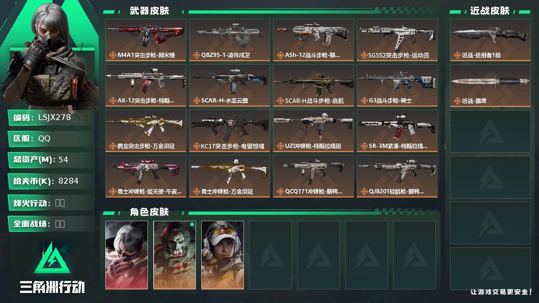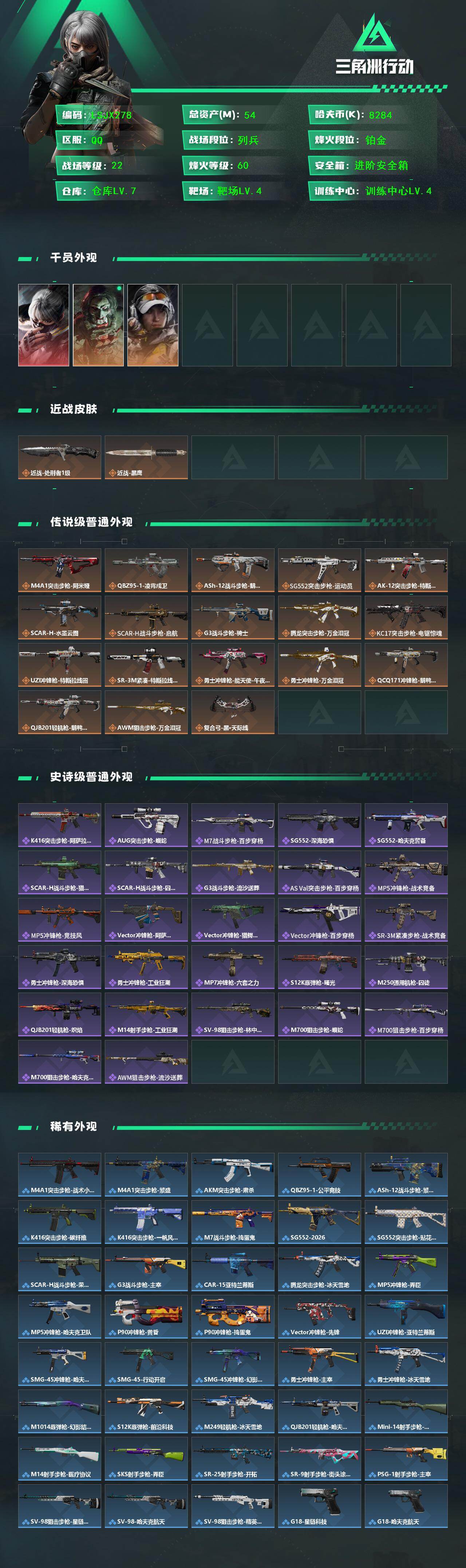 [17327869]【特价出售/店主推荐】54m总资产-8284k哈伏币-60烽火等级-铂金-22战场等级-列兵 【干员外观】:骇爪-水墨云图,红狼-电锯惊魂,露娜-金牌射手 【近战皮肤】:近战-处刑者1级,近战-黑鹰 【传说外观】:M4A1突击步枪-阿米娅,QBZ95-1突击步枪-凌霄戍卫,ASh-12战斗步枪-鹅鸭杀,SG552突击步枪-运动员,AK-12突击步枪-特斯拉线圈,SCAR-H战斗步枪-水墨云图,SCAR-H战斗步枪-启航,G3战斗步枪-骑士,腾龙突击步枪-万金泪冠,KC17突击步枪-电锯惊魂,UZI冲锋枪-特斯拉线圈,SR-3M紧凑突击步枪-特斯拉线圈,勇士冲锋枪-能天使-午夜邮差,勇士冲锋枪-万金泪冠,QCQ171冲锋枪-鹅鸭杀,QJB201轻机枪-鹅鸭杀,AWM狙击步枪-万金泪冠,复合弓-黑·天际线 【史诗外观】:K416突击步枪-阿萨拉特攻,AUG突击步枪-蝮蛇,M7战斗步枪-百步穿杨,SG552突击步枪-深海恐惧,SG552突击步枪-哈夫克警备,SCAR-H战斗步枪-猎鳄行动,SCAR-H战斗步枪-囚徒,G3战斗步枪-流沙送葬,AS Val突击步枪-百步穿杨,MP5冲锋枪-战术竞备,MP5冲锋枪-竞技风,Vector冲锋枪-阿萨拉文明,Vector冲锋枪-猎鳄行动,Vector冲锋枪-百步穿杨,SR-3M紧凑突击步枪-战术竞备,勇士冲锋枪-深海恐惧,勇士冲锋枪-工业狂潮,MP7冲锋枪-六套之力,S12K霰弹枪-曙光,M250通用机枪-囚徒,QJB201轻机枪-炽焰,M14射手步枪-工业狂潮,SV-98狙击步枪-林中猎手,M700狙击步枪-蝮蛇,M700狙击步枪-百步穿杨,M700狙击步枪-哈夫克警备,AWM狙击步枪-流沙送葬 【稀有外观】:M4A1突击步枪-战术小队,M4A1突击步枪-繁盛,AKM突击步枪-肃杀,QBZ95-1突击步枪-公平竞技,ASh-12战斗步枪-繁盛,K416突击步枪-碳纤维,K416突击步枪-一帆风顺,M7战斗步枪-捣蛋鬼,SG552突击步枪-2026,SG552突击步枪-贴花艺术,SCAR-H战斗步枪-荣耀列队,G3战斗步枪-主宰,CAR-15突击步枪-亚特兰蒂斯,腾龙突击步枪-冰天雪地,MP5冲锋枪-弄臣,MP5冲锋枪-哈夫克卫队,P90冲锋枪-黄昏,P90冲锋枪-捣蛋鬼,Vector冲锋枪-先锋,UZI冲锋枪-亚特兰蒂斯,SMG