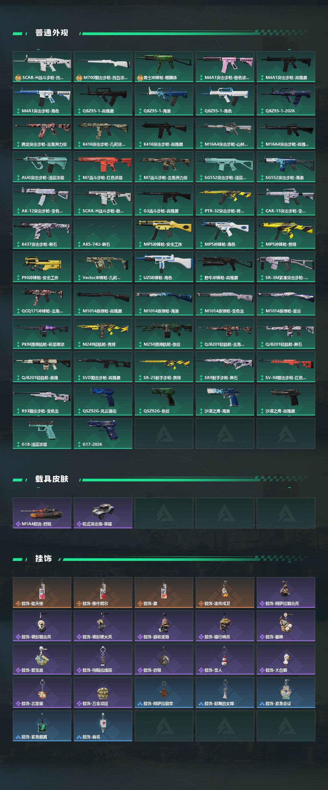 【稀有外观】:M4A1突击步枪-战术小队,M4A1突击步枪-繁盛,AKM突击步枪-肃杀,QBZ95-1突击步枪-公平竞技,ASh-12战斗步枪-繁盛,K416突击步枪-碳纤维,K416突击步枪-一帆风顺,M7战斗步枪-捣蛋鬼,SG552突击步枪-2026,SG552突击步枪-贴花艺术,SCAR-H战斗步枪-荣耀列队,G3战斗步枪-主宰,CAR-15突击步枪-亚特兰蒂斯,腾龙突击步枪-冰天雪地,MP5冲锋枪-弄臣,MP5冲锋枪-哈夫克卫队,P90冲锋枪-黄昏,P90冲锋枪-捣蛋鬼,Vector冲锋枪-先锋,UZI冲锋枪-亚特兰蒂斯,SMG