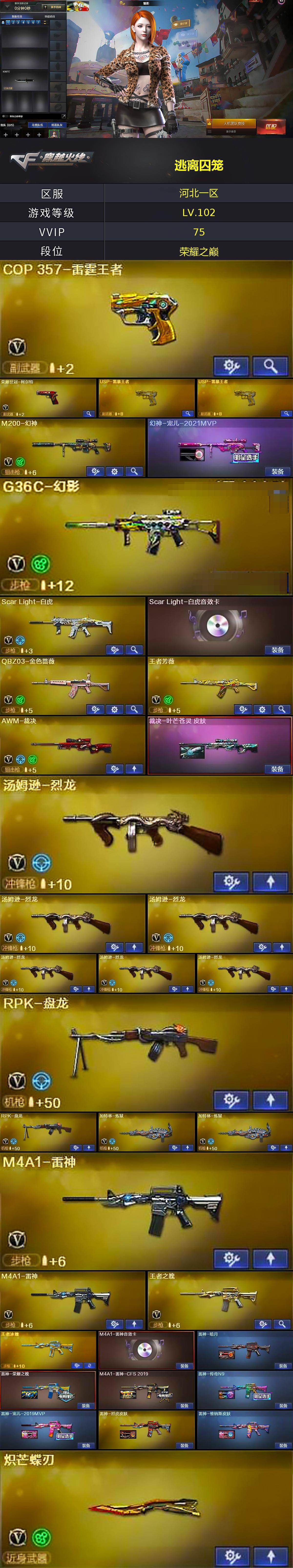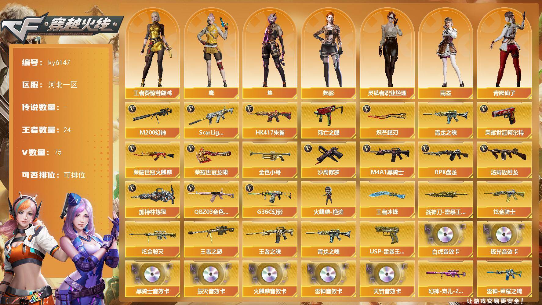 [17327922]河北一区-90V-24王者武器数-2炫金武器数 【热门武器】:G36C-幻影,QBZ03-金色蔷薇,Scar Light-白虎,HK417-朱雀,M200-幻神,死亡之眼,青龙之魄,荣耀世冠-火麒麟,荣耀世冠-柯尔特,金色小号,M4A1-黑骑士,汤姆逊-烈龙*6,RPK-盘龙*2,加特林-炼狱*2,火麒麟-绝迹,沙鹰-修罗*4,炽芒蝶刃,荣耀世冠-龙啸 【王者炫金武器】:王者之魄,青龙之魄,王者之怒,USP-雷暴王者*2,斩神刀-雷暴王者,王者冰锋,炫金骑士,炫金毁灭 【音效卡】:AK47-火麒麟音效卡,M4A1-雷神音效卡,M4A1-黑骑士音效卡,Barrett-毁灭音效卡,Barrett-极光音效卡,Scar Light-白虎音效卡,QBZ03-天罚音效卡 【皮肤】:幻神-宠儿-2021MVP,白虎-梅雀衔霜 皮肤,裁决-叶芒苍灵 皮肤,雷神-暗月,雷神-荣耀之魄,M4A1-雷神-CFS 2019,雷神-传奇N9,雷神-宠儿-2019MVP,雷神-烈虎皮肤,雷神-维纳斯皮肤,火麒麟-雷神,火麒麟-冠军之心,火麒麟-轻羽皮肤,火麒麟-心动糖果,毁灭-荣耀之怒*2,毁灭-风暴,毁灭-英雄计划 皮肤,黑骑士耀金皮肤,幻影-量子聚变 皮肤,战神-粉色甜心皮肤,战神-紫绶金章皮肤,战神-流金岁月皮肤,AWM-天龙-传奇70KG,极光-能量核心,修罗-能量核心 【角色】:魅影,鹰,隼,雨墨,王者葵-惊若翩鸿,奇洋探员,修道士,云海玲珑,空,暗夜-X,电竞少女,飞虎队-X,风暴女,嘉年华灵狐,灵狐者-X,灵狐者-黄金海岸,灵狐者-职业经理,龙儿,龙儿-小淘气,潘多拉-X,潘多拉-甜心教官,潜龙队-X,青霞仙子,莎莎,斯沃特-X,蜀雪,铁骑荣耀,兔囡囡,新娜塔莎,雪莉杨-摸金校尉,影武者-X,游珑儿 【人偶武器】:火麒麟-绝迹,迷你宝贝,AWM-灵狐-15周年嘉年华,M37-葵,迷你深渊冰龙*2,迷你生化手雷,生化手雷-机甲核心,深渊终结者手雷,闪光弹-小乔,灵狐娃娃手雷 【暴走生化】:死亡之眼,超级对讲机 【挑战大师】:VEPR-12-金魔,阐释者III 【英雄级武器】:AK47-火麒麟,M4A1-黑龙,M4A1-雷神*2,M4A1-黑骑士,AN94-超新星,AK47-机械迷城,HK417-朱雀,Scar Light-白虎,QBZ03-天罚,无影-神兵利器,G36C-幻影,