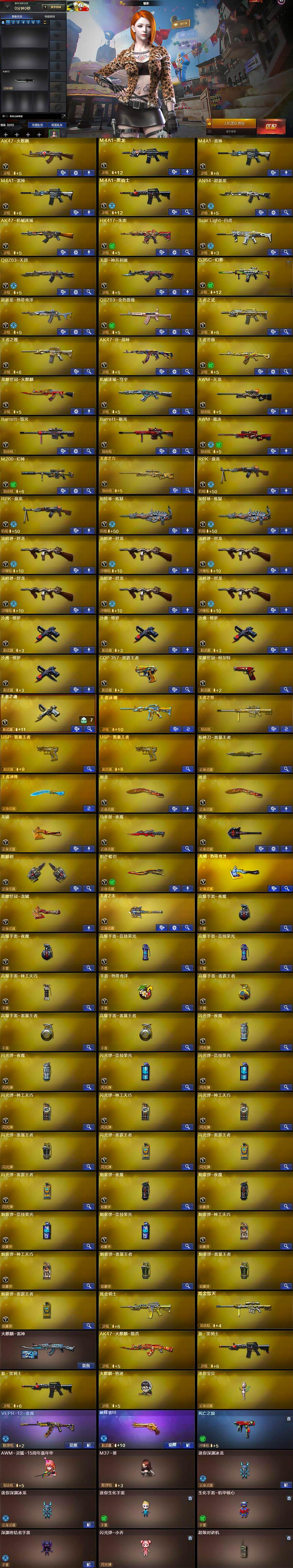 【热门武器】:G36C-幻影,QBZ03-金色蔷薇,Scar Light-白虎,HK417-朱雀,M200-幻神,死亡之眼,青龙之魄,荣耀世冠-火麒麟,荣耀世冠-柯尔特,金色小号,M4A1-黑骑士,汤姆逊-烈龙*6,RPK-盘龙*2,加特林-炼狱*2,火麒麟-绝迹,沙鹰-修罗*4,炽芒蝶刃,荣耀世冠-龙啸