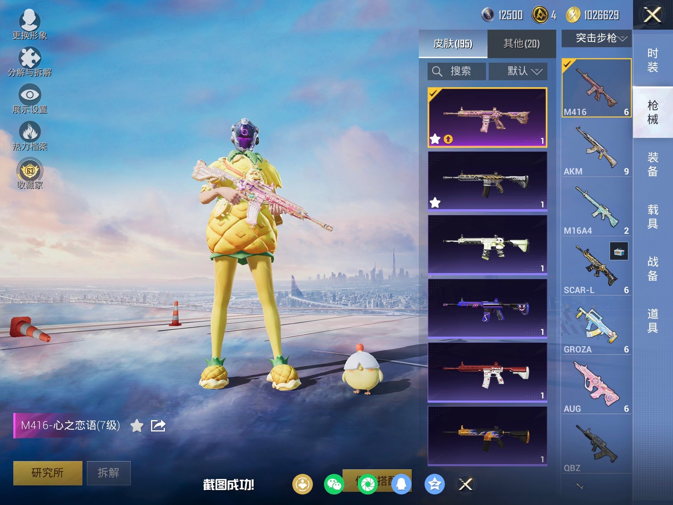 【粉色枪皮等级】:M416-心之恋语(七级),Kar98K-巳巳如意(五级),Mk14-福马献瑞(五级),M249-彩虹甜喵(七级),DP-28-豹影疾电(五级)