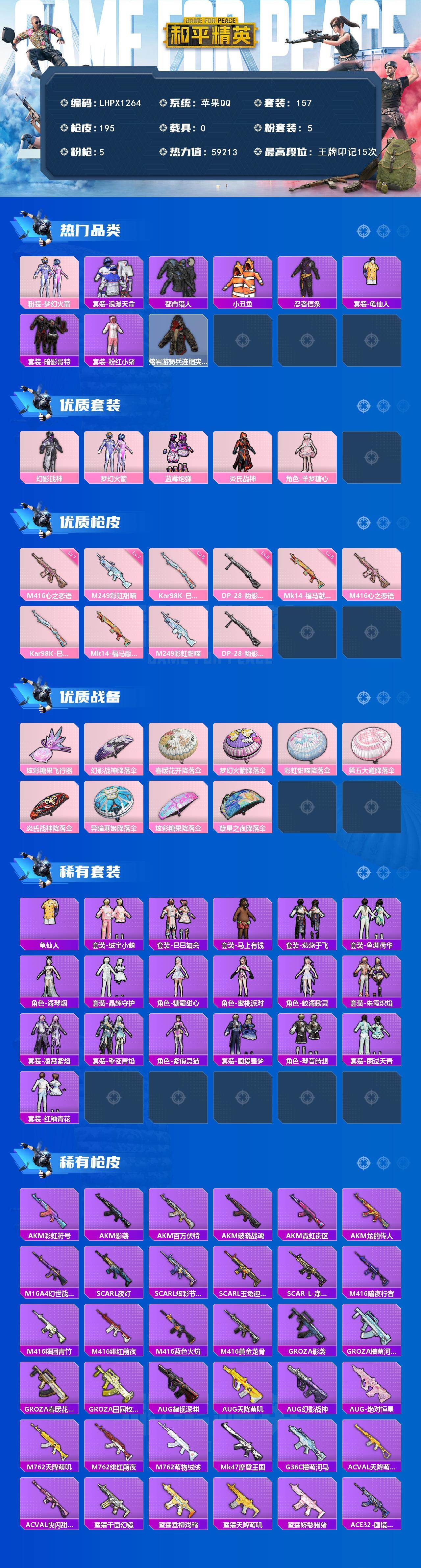 [17327980]【特价出售/店主推荐】苹果 手Q-5粉装-5特效枪-0载具-1粉色飞行器-59213热力值-15王牌印记-157套装-195枪皮 【热门品类】:粉装-梦幻火箭,套装-浪漫天命,套装-都市猎人,套装-小丑鱼,套装-忍者信条,套装-龟仙人,套装-暗影哥特,套装-粉红小猪,熔岩游骑兵连帽夹克 【粉色套装】:粉装-幻影战神,粉装-梦幻火箭,粉装-蓝莓炮弹,粉装-炎氏战神,角色-羊梦糖心 【粉色枪皮等级】:M416-心之恋语(七级),Kar98K-巳巳如意(五级),Mk14-福马献瑞(五级),M249-彩虹甜喵(七级),DP-28-豹影疾电(五级) 【粉色枪皮】:M416-心之恋语,Kar98K-巳巳如意,Mk14-福马献瑞,M249-彩虹甜喵,DP-28-豹影疾电 【粉色飞行器】:炫彩糖果飞行器 【粉色降落伞】:幻影战神降落伞,春暖花开降落伞,梦幻火箭降落伞,彩虹甜喵降落伞,第五大道降落伞,炎氏战神降落伞,异瞳寒姬降落伞,炫彩糖果降落伞,旋星之夜降落伞 【稀有套装】:套装-龟仙人,套装-绒宝小鹅,套装-巳巳如意,套装-雪国风尚,套装-炫彩糖果,套装-马上有钱,套装-燕燕于飞,套装-鱼渊荷华,角色-海琴烟,套装-晶辉守护,角色-糖霜甜心,角色-蜜桃派对,角色-鲛海歌灵,套装-朱霞炽焰,套装-凌霄紫焰,套装-擎苍青焰,角色-紫俏灵猫,套装-画境星梦,套装-琴音绮想,套装-雨过天青,套装-红釉青花 【稀有枪皮】:AKM-彩虹符号,AKM-影袭,AKM-百万伏特,AKM-破晓战魂,AKM-霓虹街区,AKM-龙的传人,M16A4-幻世战舞者,SCAR-L-夜灯,SCAR-L-炫彩节奏,SCAR-L-玉兔迎春,SCAR-L-净心行者,M416-暗夜行者,M416-糯团青竹,M416-绯红前夜,M416-蓝色火焰,M416-黄金龙骨,GROZA-影袭,GROZA-懵萌河马,GROZA-春暖花开,GROZA-田园牧歌,AUG-凝视深渊,AUG-天降萌叽,AUG-幻影战神,AUG-绝对恒星,M762-天降萌叽,M762-绯红前夜,M762-萌物绒绒,Mk47-摩登王国,G36C-懵萌河马,AC-VAL-天降萌叽,AC-VAL-快闪甜心,蜜獾-千面幻镜,蜜獾-垂柳戏鸭,蜜獾-天降萌叽,蜜獾-娇憨猪猪,ACE32-画境星梦,ARX-凌霄紫焰,UZI-啾咪啾咪,UZI-天降萌叽,UZI-娇憨猪猪