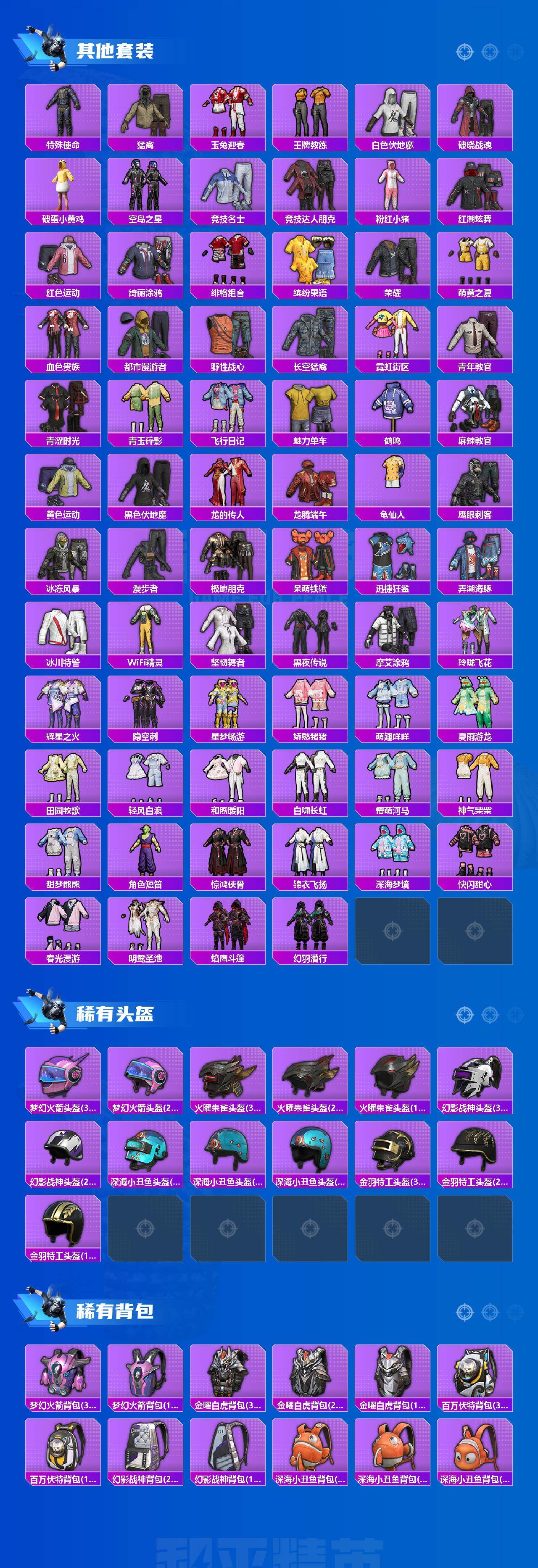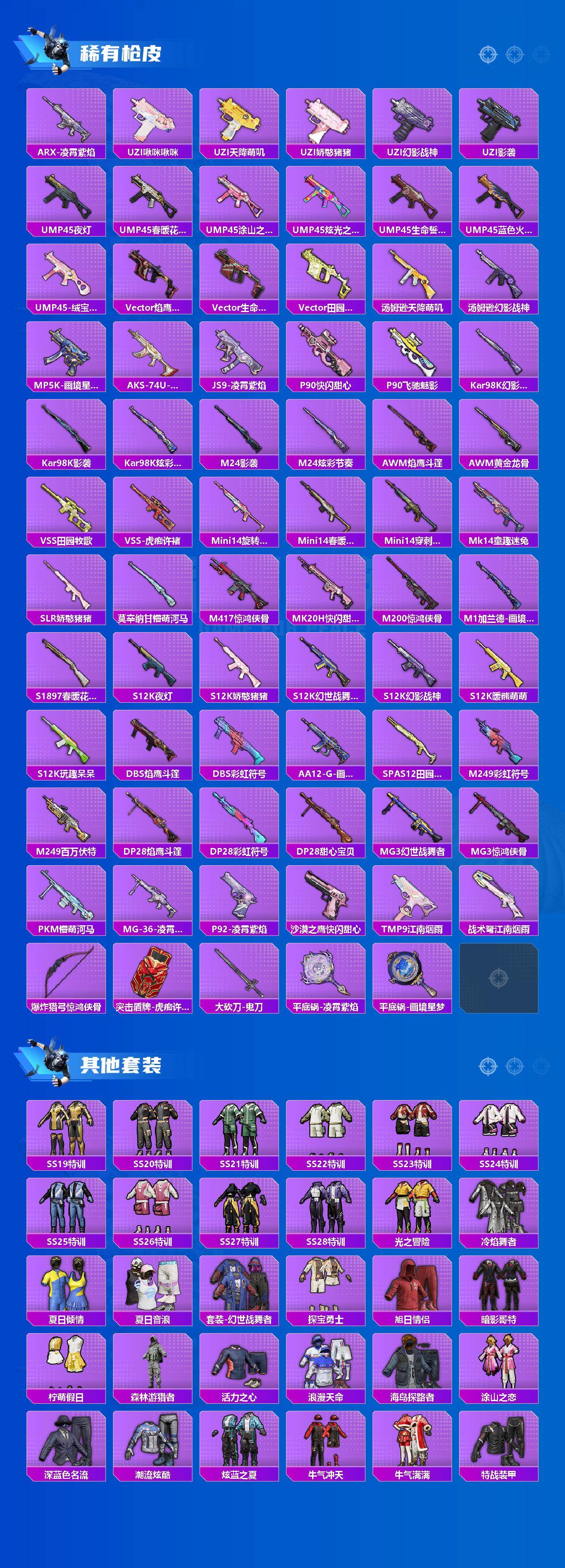 【稀有枪皮】:AKM-彩虹符号,AKM-影袭,AKM-百万伏特,AKM-破晓战魂,AKM-霓虹街区,AKM-龙的传人,M16A4-幻世战舞者,SCAR-L-夜灯,SCAR-L-炫彩节奏,SCAR-L-玉兔迎春,SCAR-L-净心行者,M416-暗夜行者,M416-糯团青竹,M416-绯红前夜,M416-蓝色火焰,M416-黄金龙骨,GROZA-影袭,GROZA-懵萌河马,GROZA-春暖花开,GROZA-田园牧歌,AUG-凝视深渊,AUG-天降萌叽,AUG-幻影战神,AUG-绝对恒星,M762-天降萌叽,M762-绯红前夜,M762-萌物绒绒,Mk47-摩登王国,G36C-懵萌河马,AC-VAL-天降萌叽,AC-VAL-快闪甜心,蜜獾-千面幻镜,蜜獾-垂柳戏鸭,蜜獾-天降萌叽,蜜獾-娇憨猪猪,ACE32-画境星梦,ARX-凌霄紫焰,UZI-啾咪啾咪,UZI-天降萌叽,UZI-娇憨猪猪
