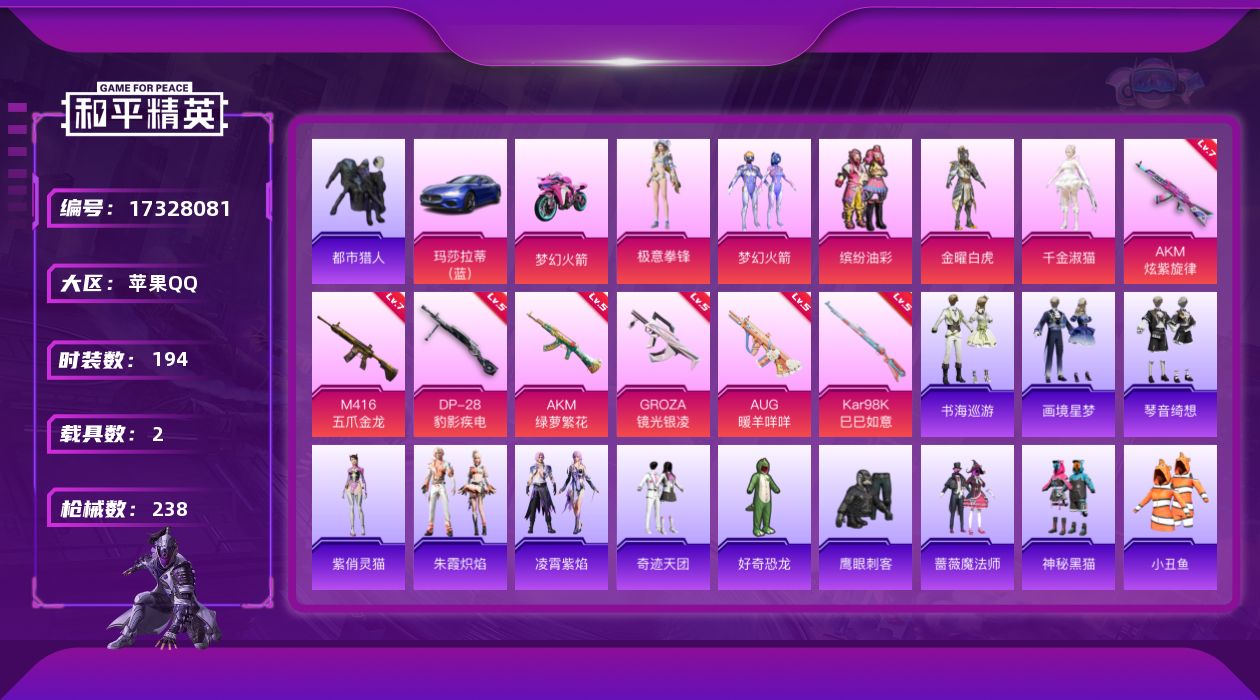 - [11520080]5粉装 4特效枪 1载具 4印记 可二次 可修改实名 热门装扮:奇迹舞步-美雪,雪月幻音,绯穹魔姬,绯果甜心,星穹咏叹调,兔兔白日梦 载具:霜龙神御(云雾蓝) 稀有枪皮:AMR-智耀战神,SVD-月影灵韵,Kar98K-巳巳如意 七级特效枪:七级AMR-智耀战神 五级特效枪:五级SVD-月影灵韵,五级Kar98K-巳巳如意,五级DP-28-豹影疾电 紫色装扮:SS22特训,SS23特训,SS21特训,SS30特训套装,冷焰舞者,极速光影,SS31特训套装,云朵鹅,雪绒豹,SS33特训套装,顶瓜瓜,混沌火种,SS14特训,豚鼠丹丹,SS17特训,长空猛禽,都市漫游者,都市魅力,酒红色名流,金鼠迎春,缤纷果语,蓝彩潮人,街头潮人,蓝海鲸歌,龙的传人,骑行爱好者,魅力单车,麻辣教官,香桃花海,绮丽涂鸦,柠萌假日,怒火燎原,甜蜜熊情侣,破蛋小黄鸡,王牌教练,福星高照,竞技达人朋克,猛禽,热血青春,牛气冲天,猎鹰,牛气满满,迎夏光舞,巳巳如意,俏兔智灵,光矢逐梦,异域银装,鱼渊荷华,玉兔迎春,燕燕于飞,竞技名士,街头风暴,智谋强哥,SS25特训,SS24特训(SS24特训套装),粉红小猪,大橘大利,星渊小夜曲,耀粉歌者,小熊蜂蜜罐,粉恋花,蓝冰羽,紫幽梦,SS32特训服(SS32特训套装),萌萌史莱姆,猎影月神,绯格组合,萌黄之夏,晨曦轻云,白糯汤圆,雪夜云雾,糖霜甜心,琉璃花蕾,白辉玉蕊,恋语绒绒,Z.I.B特工,鲛海歌灵,幽澜祭司,光之冒险 优质战备:星途旅人降落伞,双重狂想降落伞,幻彩电音降落伞,幻星舰长飞行器,辉羽雀灵降落伞,幻海仙踪降落伞,月影灵韵降落伞,智耀战神降落伞,戏水时光降落伞,墨金战记降落伞,戏水时光飞行器,彩虹独角兽飞行器,翎光蝶翼降落伞,月下星之子降落伞,炫光之旅降落伞