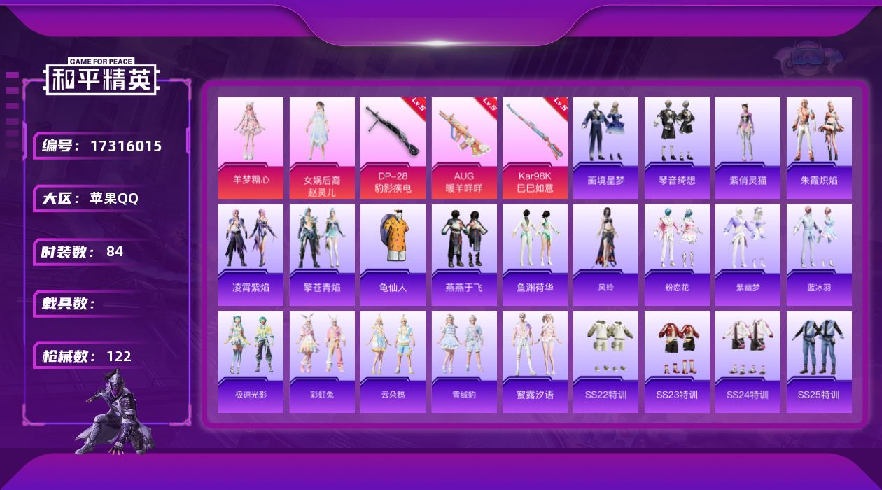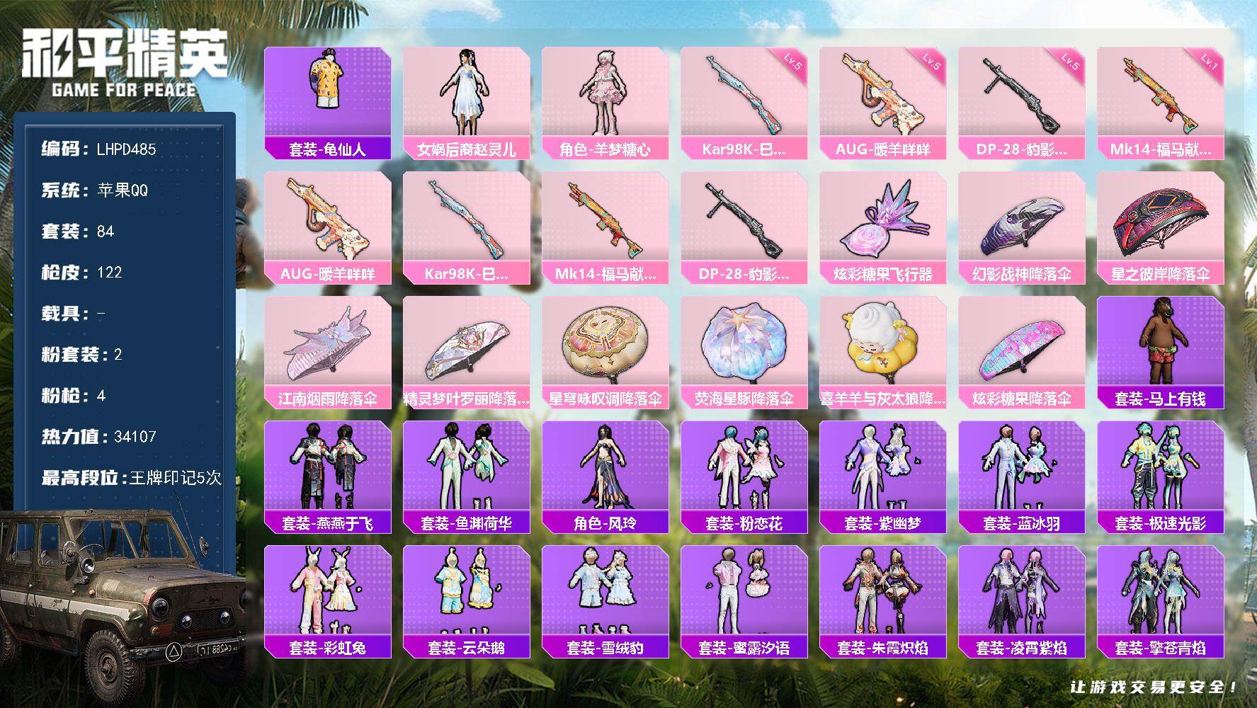 [17316015]【特价出售/店主推荐】苹果 手Q-2粉装-4特效枪-0载具-1粉色飞行器-34107热力值-5王牌印记-84套装-122枪皮