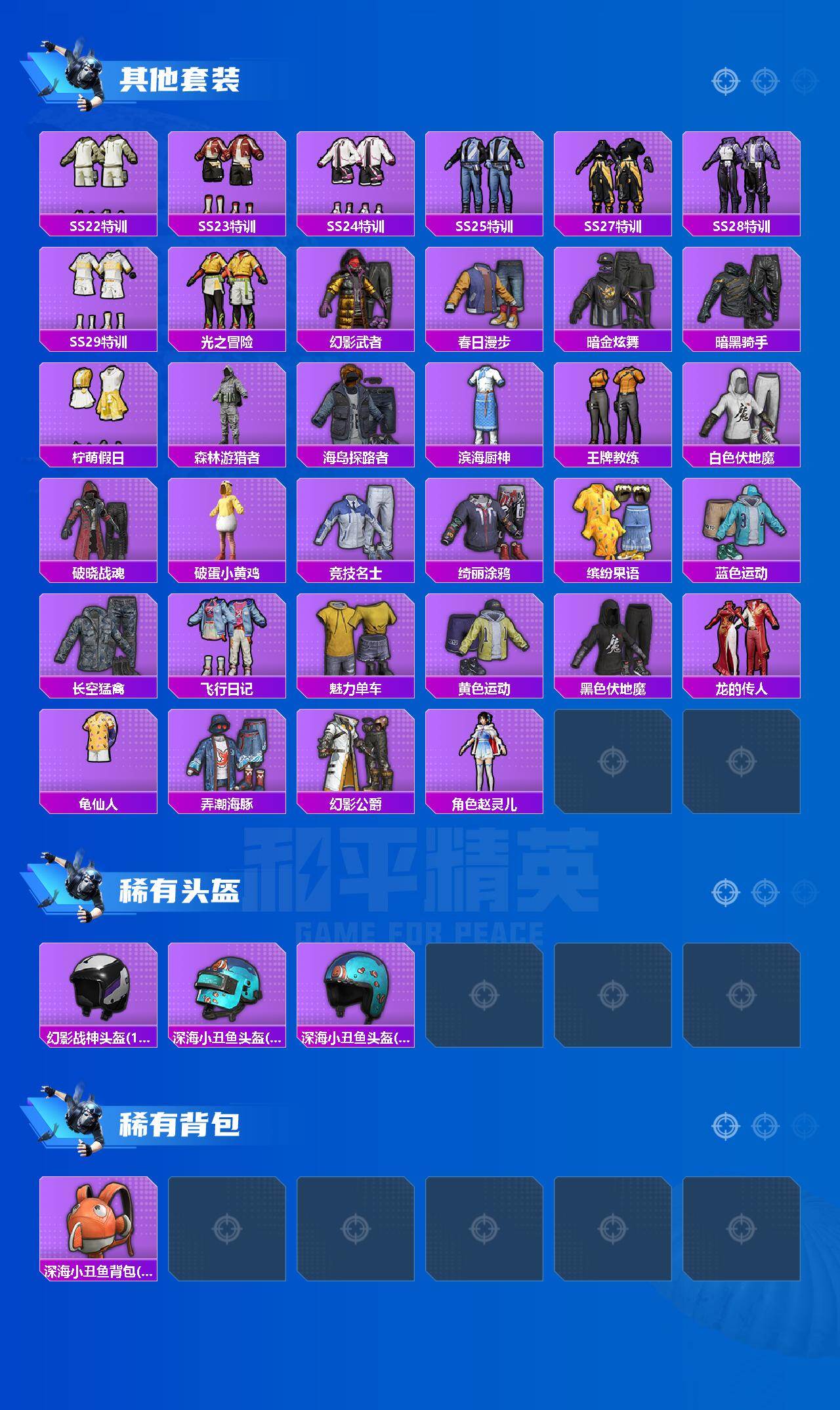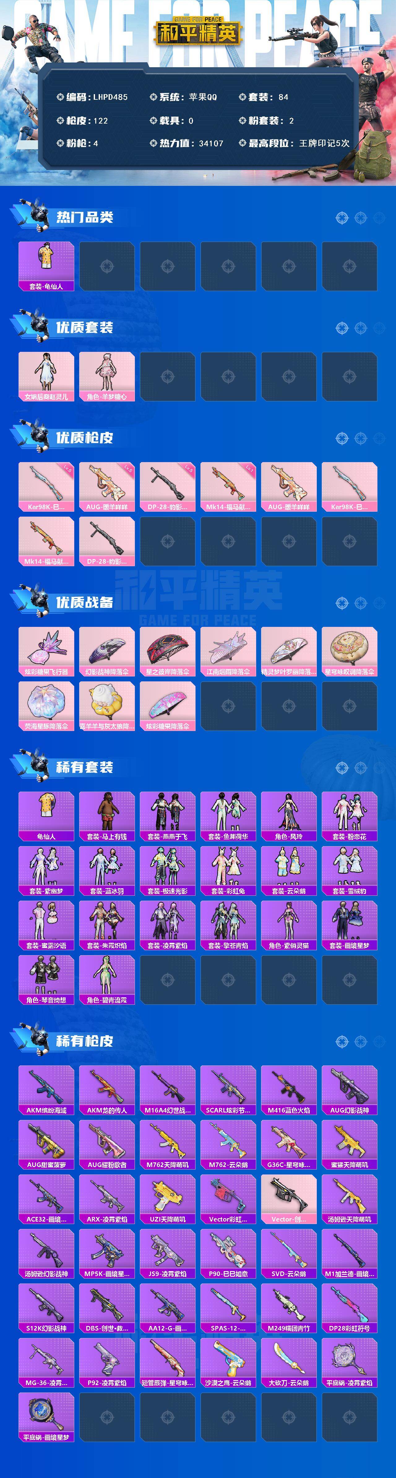 [17316015]【特价出售/店主推荐】苹果 手Q-2粉装-4特效枪-0载具-1粉色飞行器-34107热力值-5王牌印记-84套装-122枪皮 【热门品类】:套装-龟仙人 【粉色套装】:女娲后裔-赵灵儿,角色-羊梦糖心 【粉色枪皮等级】:AUG-暖羊咩咩(五级),Kar98K-巳巳如意(五级),Mk14-福马献瑞(一级),DP-28-豹影疾电(五级) 【粉色枪皮】:AUG-暖羊咩咩,Kar98K-巳巳如意,Mk14-福马献瑞,DP-28-豹影疾电 【粉色飞行器】:炫彩糖果飞行器 【粉色降落伞】:幻影战神降落伞,星之彼岸降落伞,江南烟雨降落伞,精灵梦叶罗丽降落伞,星穹咏叹调降落伞,荧海星豚降落伞,喜羊羊与灰太狼降落伞,炫彩糖果降落伞 【稀有套装】:套装-龟仙人,套装-炫彩糖果,套装-马上有钱,套装-燕燕于飞,套装-鱼渊荷华,角色-风玲,套装-粉恋花,套装-紫幽梦,套装-蓝冰羽,套装-极速光影,套装-彩虹兔,套装-云朵鹅,套装-雪绒豹,套装-蜜露汐语,套装-朱霞炽焰,套装-凌霄紫焰,套装-擎苍青焰,角色-紫俏灵猫,套装-画境星梦,套装-琴音绮想,角色-碧青流霞 【稀有枪皮】:AUG-冰晶雪宝,AKM-缤纷海域,AKM-龙的传人,M16A4-幻世战舞者,SCAR-L-炫彩节奏,M416-蓝色火焰,AUG-幻影战神,AUG-甜蜜菠萝,AUG-耀粉歌者,M762-天降萌叽,M762-云朵鹅,G36C-星穹咏叹调,蜜獾-天降萌叽,ACE32-画境星梦,ARX-凌霄紫焰,UZI-天降萌叽,Vector-彩虹符号,Vector-创世·救赎,汤姆逊-天降萌叽,汤姆逊-幻影战神,MP5K-画境星梦,JS9-凌霄紫焰,P90-巳巳如意,SVD-云朵鹅,M1加兰德-画境星梦,S12K-幻影战神,DBS-创世·救赎,AA12-G-画境星梦,SPAS-12-云朵鹅,M249-糯团青竹,DP-28-彩虹符号,MG-36-凌霄紫焰,P92-凌霄紫焰,短管霰弹-星穹咏叹调,沙漠之鹰-云朵鹅,大砍刀-云朵鹅,平底锅-凌霄紫焰,平底锅-画境星梦 【其他套装】:套装-SS22特训,套装-SS23特训,套装-SS24特训,套装-SS25特训,套装-SS27特训,套装-SS28特训,套装-SS29特训,套装-光之冒险,套装-幻影武者,套装-春日漫步,套装-暗金炫舞,套装-暗黑骑手,套装-柠萌假日,套装-森林游猎者,套装-海岛