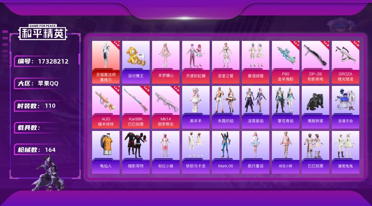 [17328212]苹果 手Q-1神装-4粉装-6特效枪-0载具-0粉色飞行器-47121热力值-9王牌印记-110套装-164枪皮