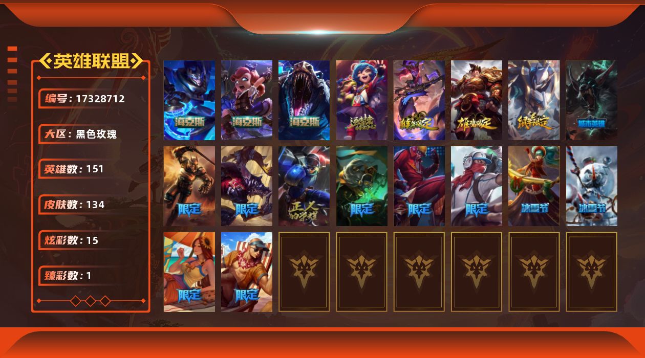 [17328712]【店主推荐捡漏号】未定级段位-151英雄-134皮肤-15炫彩-0终极-5神话-18限定-16传说-27史诗