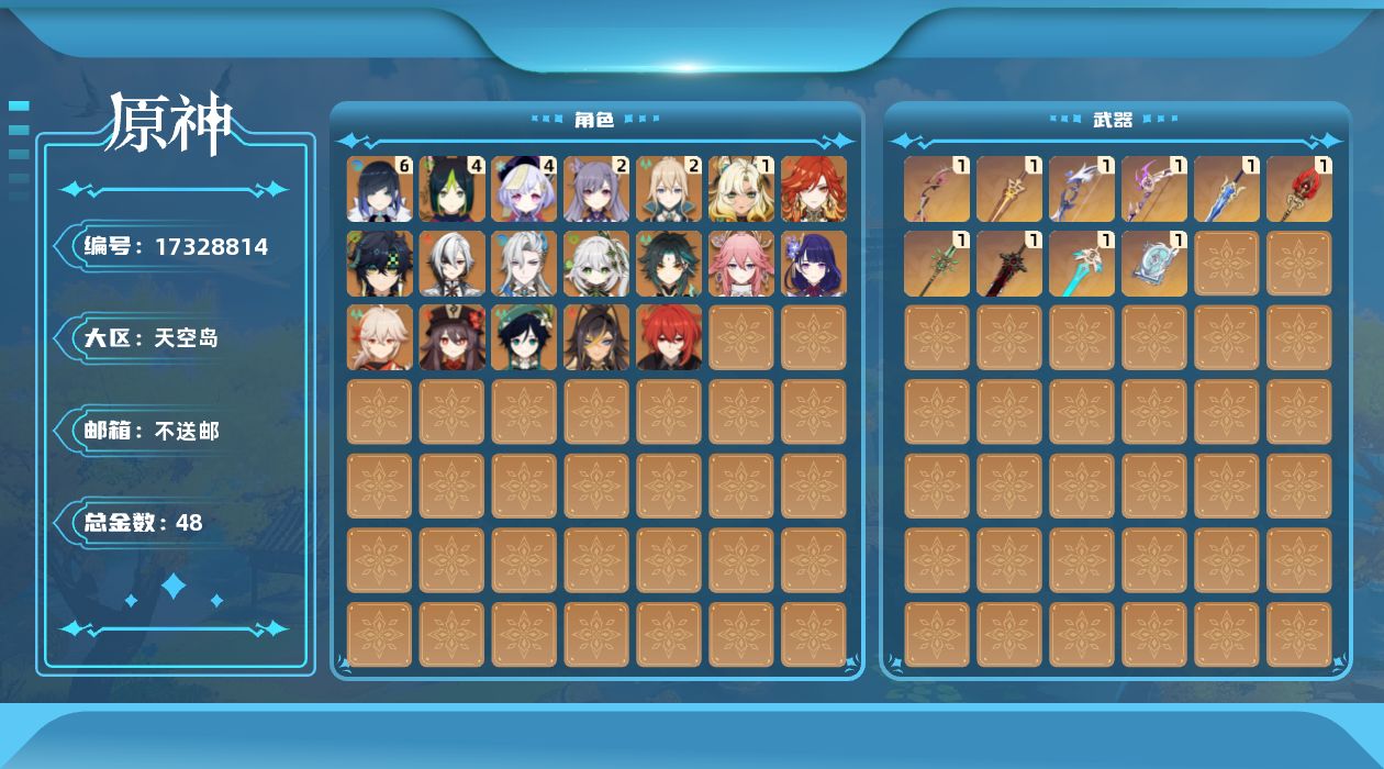 0命阿蕾奇诺,0命那维莱特,0命迪希雅,0命纳西妲,4命提纳里,满命夜兰,0命八重神子,0命雷电将军,0命枫原万叶,0命胡桃,0命魈,0命温迪,2命刻晴,4命七七,2命琴,0命迪卢克,0命基尼奇,1命希诺宁,0命玛薇卡,精1最初的大魔术,精1圣显之钥,精1若水,精1飞雷之弦振,精1松籁响起之时,精1护摩之杖,精1四风原典,精1和璞鸢,精1天空之刃,精1狼的末路
