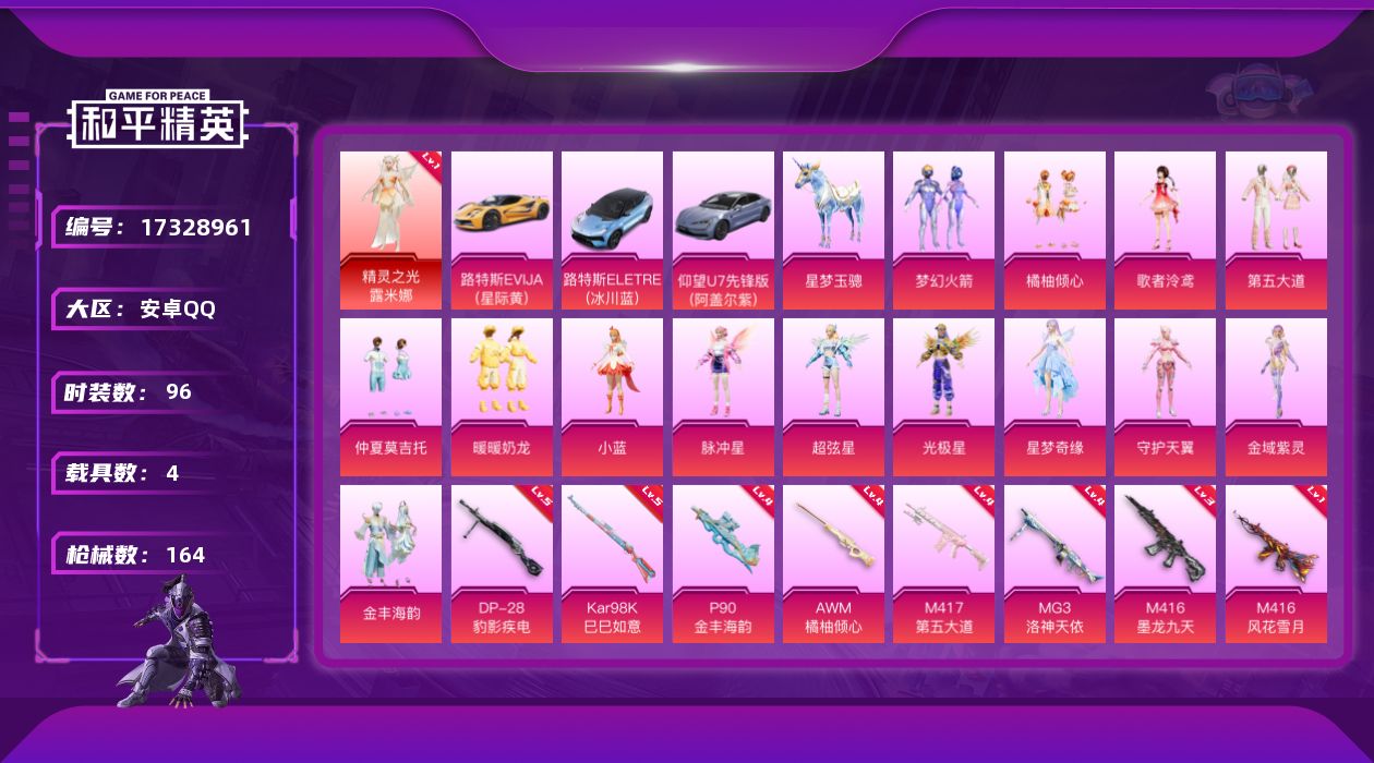[17328961]安卓 手Q-1神装-14粉装-10特效枪-4载具-8粉色飞行器-57706热力值-7王牌印记-96套装-164枪皮