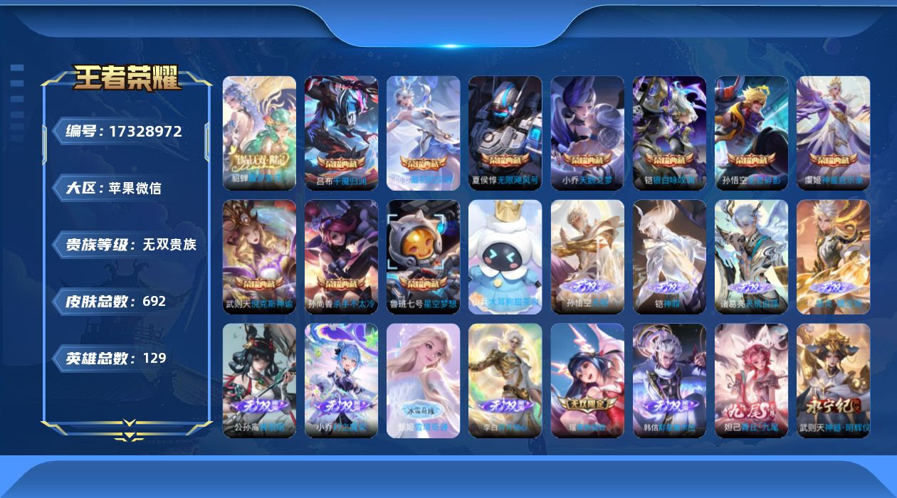 [17328972]无双V10!苹果WX-最强王者段位-129英雄-692皮肤-10典藏皮肤-1典藏英雄-1珍品无双-12无双-9珍品传说-122传说-250史诗-6星传说-84按键-13天幕