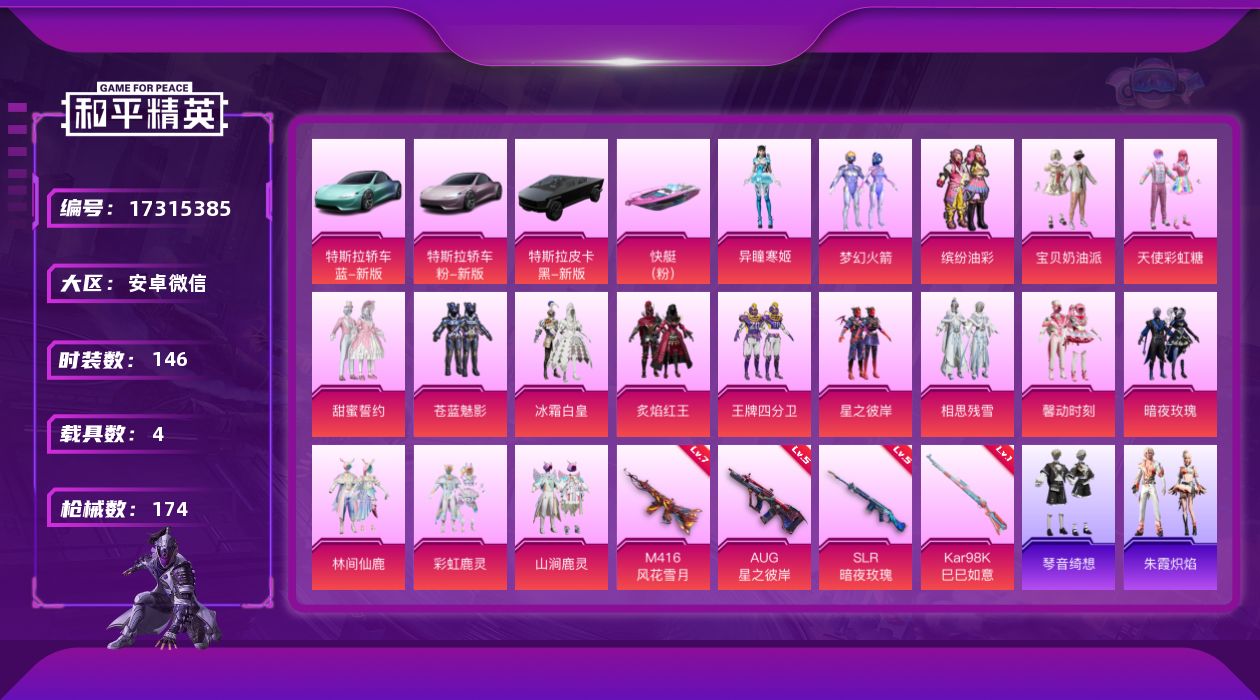 [17315385]【特价出售/店主推荐】 安卓 微信-17粉装-4特效枪-4载具-6粉色飞行器-71994热力值-8王牌印记-146套装-174枪皮 【热门品类】:粉装-梦幻火箭,粉装-缤纷油彩 【粉色套装】:粉装-宝贝奶油派,粉装-天使彩虹糖,粉装-梦幻火箭,粉装-缤纷油彩,粉装-甜蜜誓约,粉装-苍蓝魅影,粉装-冰霜白皇,粉装-炙焰红王,粉装-王牌四分卫,粉装-星之彼岸,粉装-相思残雪,粉装-馨动时刻,粉装-暗夜玫瑰,粉装-林间仙鹿,粉装-彩虹鹿灵,粉装-山涧鹿灵,角色-异瞳寒姬 【粉色枪皮等级】:M416-风花雪月(七级),AUG-星之彼岸(五级),Kar98K-巳巳如意(一级),SLR-暗夜玫瑰(五级) 【粉色载具】:特斯拉Roadster(水滴蓝),特斯拉Roadster(沁心粉),特斯拉Cybertruck(极昼黑),空客H135-蔚蓝之翼,快艇-塞莎KL27(霓虹粉) 【粉色枪皮】:M416-风花雪月,AUG-星之彼岸,Kar98K-巳巳如意,SLR-暗夜玫瑰 【粉色飞行器】:梦幻火箭飞行器,甜蜜誓约飞行器,激战未来飞行器,绮梦青鸾飞行器,星之彼岸飞行器 【粉色降落伞】:甜心宝贝降落伞,梦幻火箭降落伞,甜蜜誓约降落伞,香水柠檬降落伞,暗翼战神降落伞,王牌四分卫降落伞,星之彼岸降落伞,相思残雪降落伞,怪笑疯兔降落伞,葫芦兄弟降落伞,暗夜玫瑰降落伞,林间仙鹿降落伞,海渊国主降落伞,蓝莓炮弹降落伞,炫光之旅降落伞,冷漠罗丽降落伞,炫彩糖果降落伞 【稀有套装】:套装-糖糖葫芦,套装-青团波波,套装-棉花软糖,角色-都市丽猫,套装-燕燕于飞,套装-鱼渊荷华,套装-霓虹热舞,套装-彩虹兔,套装-云朵鹅,套装-雪绒豹,套装-朱霞炽焰,套装-凌霄紫焰,套装-琴音绮想,套装-炫彩糖果 【稀有枪皮】:AKM-彩虹符号,AKM-星之彼岸,AKM-缤纷海域,AKM-萌趣颜团子,AKM-虎虎生威,AKM-龙的传人,M16A4-幻世战舞者,M16A4-甜心亚梦,SCAR-L-夏日绵绵冰,SCAR-L-暗夜玫瑰,SCAR-L-炫彩节奏,SCAR-L-玉兔迎春,SCAR-L-王牌四分卫,SCAR-L-甜蜜誓约,SCAR-L-碧影闪光,GROZA-异彩先驱,GROZA-彩虹符号,GROZA-林间仙鹿,GROZA-治愈之星,AUG-青春冒险家,QBZ-彩虹符号,QBZ-洛神天依,QBZ-电玩视界,QBZ-