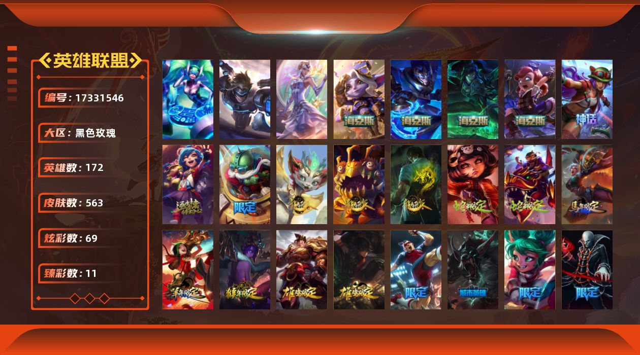 黄金段位-172英雄-563皮肤-69炫彩-3终极-7神话-103限定-42传说-153史诗