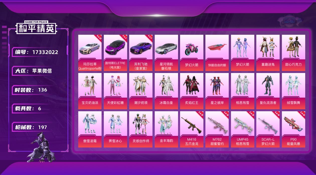[17332022]苹果 微信-16粉装-9特效枪-6载具-9粉色飞行器-81846热力值-11王牌印记-136套装-197枪皮