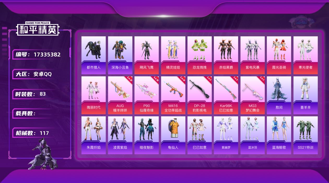 [17335382]安卓 手Q-8粉装-8特效枪-0载具-0粉色飞行器-32125热力值-2王牌印记-83套装-117枪皮