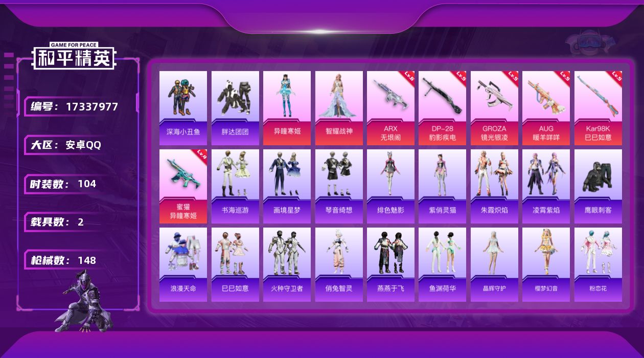 [17337977]安卓 手Q-1神装-3粉装-9特效枪-2载具-3粉色飞行器-46578热力值-3王牌印记-104套装-148枪皮