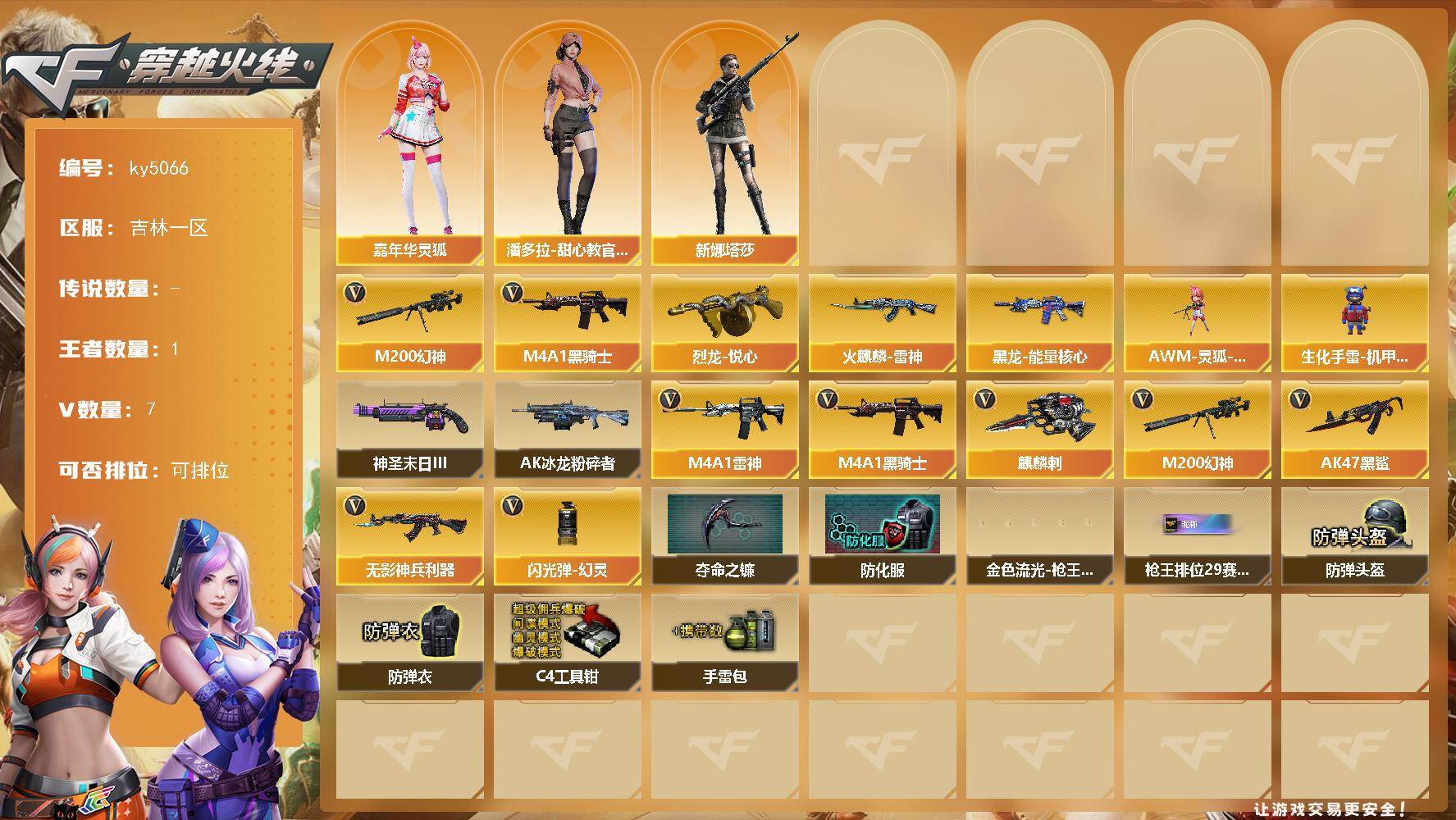 [17339705]吉林一区-7V-1王者-0炫金 【热门武器】:M200-幻神,M4A1-黑骑士 【王者炫金武器】:烈龙-悦心 【皮肤】:火麒麟-雷神,黑龙-能量核心 【角色】:嘉年华灵狐,潘多拉-甜心教官,新娜塔莎 【人偶武器】:AWM-灵狐-15周年嘉年华,生化手雷-机甲核心 【挑战大师】:AK47-冰龙粉碎者,神圣爆裂者-末日III 【英雄级武器】:M4A1-雷神,M4A1-黑骑士,AK47-黑鲨,无影-神兵利器,M200-幻神,麒麟刺,闪光弹-幻灵 【道具】:夺命之镰,防化服,金色流光-枪王排位*2,星辰流光-枪王排位,枪王排位28赛季金色流光,枪王排位29赛季金色流光,防弹头盔*5,防弹衣*5,C4工具钳*3,手雷包*3 【特殊枪械】:1黑骑士