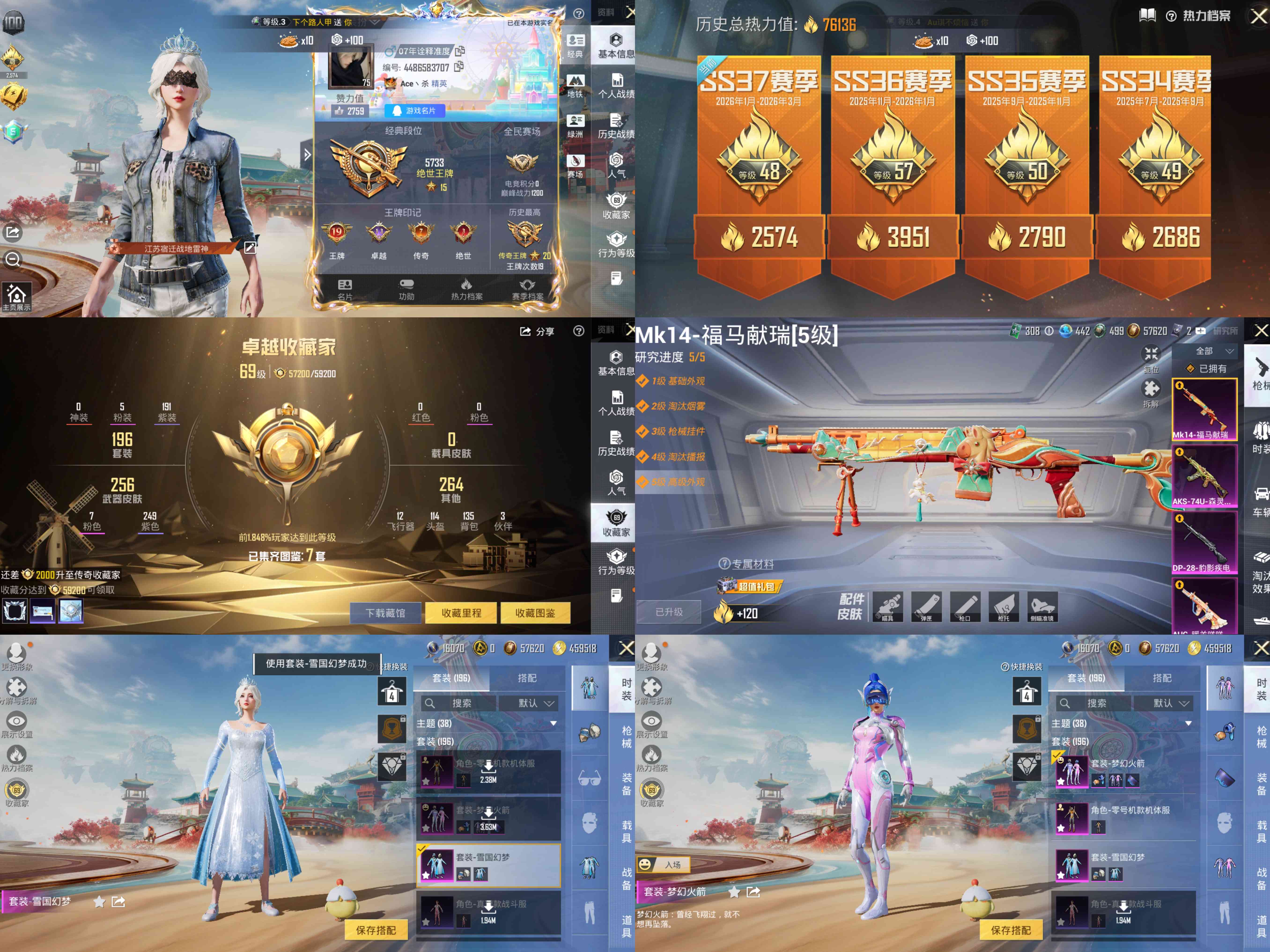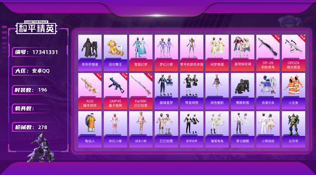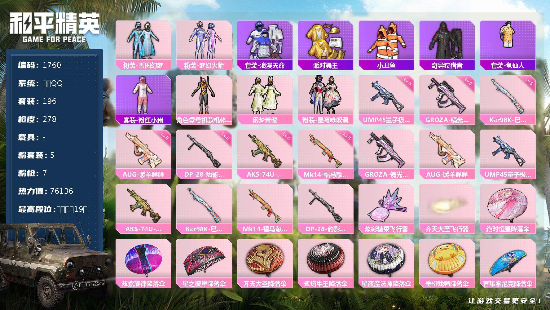 [17341331]【1760】安卓 手Q-5粉装-7特效枪-0载具-3粉色飞行器-76136热力值-19王牌印记-196套装-278枪皮