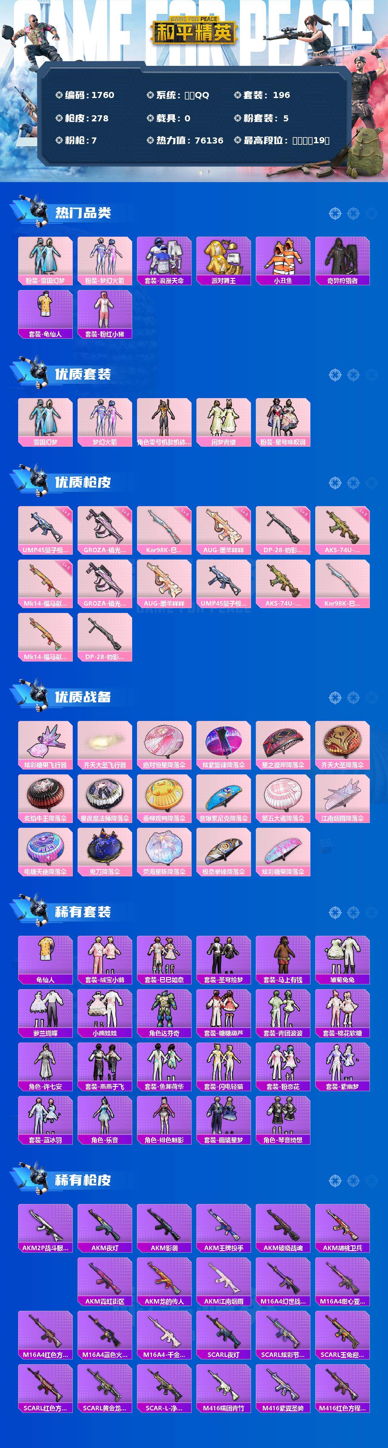 [17341331]【1760】安卓 手Q-5粉装-7特效枪-0载具-3粉色飞行器-76136热力值-19王牌印记-196套装-278枪皮 【热门品类】:粉装-雪国幻梦,粉装-梦幻火箭,套装-浪漫天命,套装-派对舞王,套装-小丑鱼,套装-奇异狩猎者,套装-龟仙人,套装-粉红小猪 【粉色套装】:粉装-雪国幻梦,粉装-梦幻火箭,角色-零号机款机体服,粉装-闲梦青缨,粉装-星穹咏叹调 【粉色枪皮等级】:GROZA-镜光银凌(五级),AUG-暖羊咩咩(五级),UMP45-量子极限(五级),AKS-74U-森灵之息(五级),Kar98K-巳巳如意(五级),Mk14-福马献瑞(五级),DP-28-豹影疾电(五级) 【粉色枪皮】:GROZA-镜光银凌,AUG-暖羊咩咩,UMP45-量子极限,AKS-74U-森灵之息,Kar98K-巳巳如意,Mk14-福马献瑞,DP-28-豹影疾电 【粉色飞行器】:炫彩糖果飞行器,齐天大圣飞行器 【粉色降落伞】:绝对恒星降落伞,炫紫旋律降落伞,星之彼岸降落伞,齐天大圣降落伞,炙焰牛王降落伞,星夜魔法师降落伞,垂柳戏鸭降落伞,音爆索尼克降落伞,第五大道降落伞,江南烟雨降落伞,电糖天使降落伞,鬼刀降落伞,荧海星豚降落伞,极意拳锋降落伞,炫彩糖果降落伞 【稀有套装】:套装-龟仙人,套装-绒宝小鹅,套装-巳巳如意,套装-圣穹绘梦,套装-雪国风尚,套装-炫彩糖果,套装-马上有钱,套装-雏菊兔兔,套装-萝兰蝴蝶,套装-小熊娃娃,角色-达芬奇,套装-糖糖葫芦,套装-青团波波,套装-棉花软糖,角色-许七安,套装-燕燕于飞,套装-鱼渊荷华,套装-闪电轻猫,套装-粉恋花,套装-紫幽梦,套装-蓝冰羽,角色-乐音,角色-绯色魅影,套装-画境星梦,套装-琴音绮想 【稀有枪皮】:AUG-冰晶雪宝,AKM-2P战斗服款,AKM-夜灯,AKM-影袭,AKM-江南烟雨,AKM-王牌投手,AKM-破晓战魂,AKM-胡桃卫兵,AKM-虎虎生威,AKM-霓虹街区,AKM-龙的传人,M16A4-幻世战舞者,M16A4-甜心亚梦,M16A4-红色方程式,M16A4-蓝色火焰,M16A4-千金淑猫,SCAR-L-夜灯,SCAR-L-炫彩节奏,SCAR-L-玉兔迎春,SCAR-L-红色方程式,SCAR-L-黄金龙骨,SCAR-L-净心行者,M416-糯团青竹,M416-紫翼圣骑,M416-红色方程式,M416-蓝