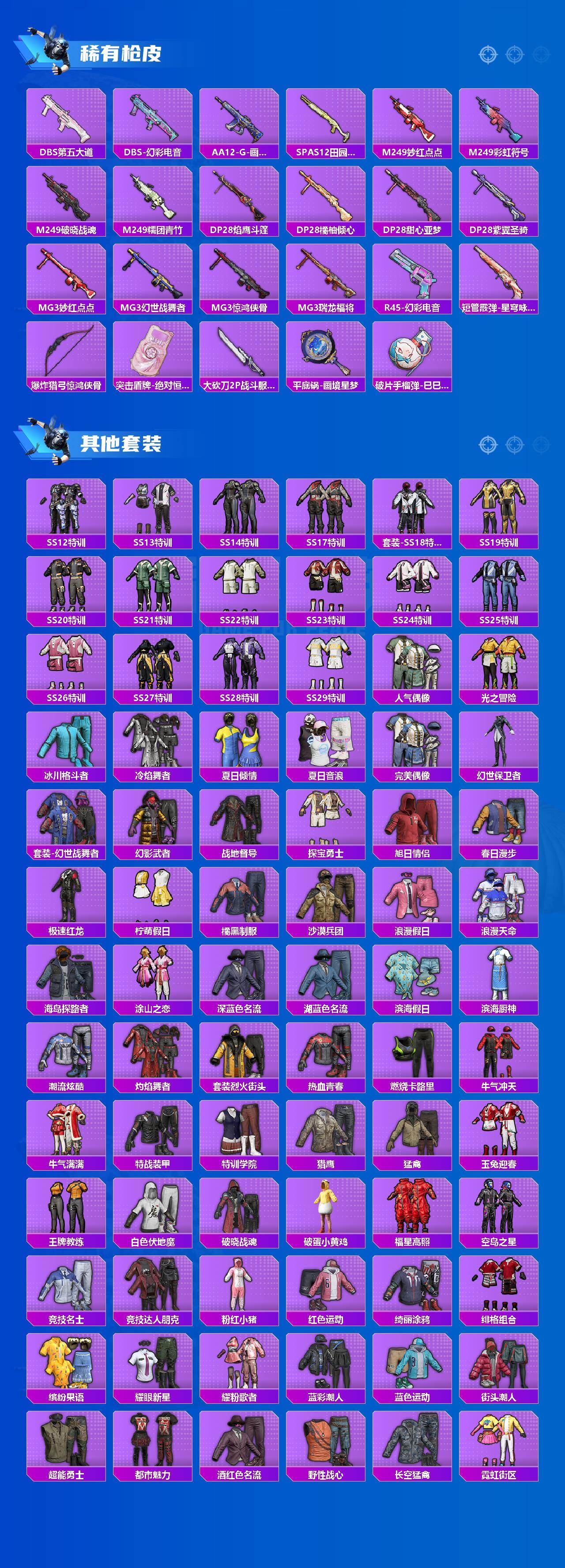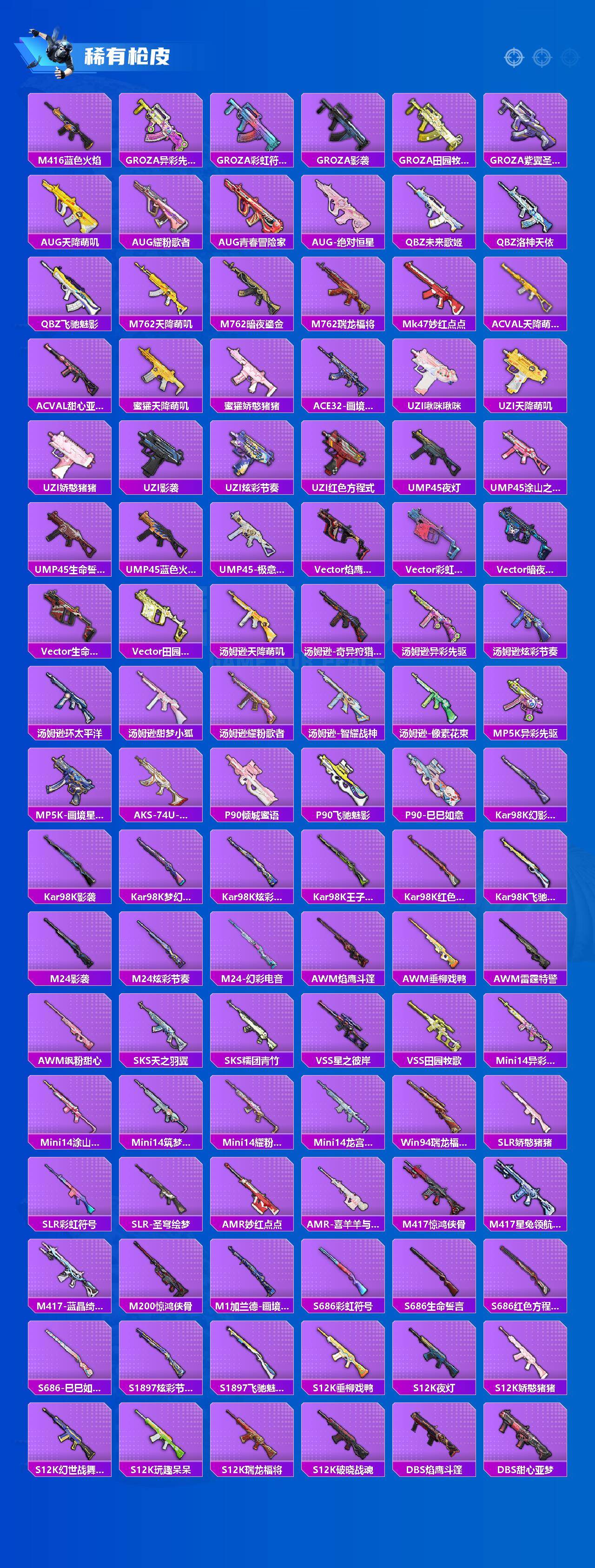 【稀有枪皮】:AUG-冰晶雪宝,AKM-2P战斗服款,AKM-夜灯,AKM-影袭,AKM-江南烟雨,AKM-王牌投手,AKM-破晓战魂,AKM-胡桃卫兵,AKM-虎虎生威,AKM-霓虹街区,AKM-龙的传人,M16A4-幻世战舞者,M16A4-甜心亚梦,M16A4-红色方程式,M16A4-蓝色火焰,M16A4-千金淑猫,SCAR-L-夜灯,SCAR-L-炫彩节奏,SCAR-L-玉兔迎春,SCAR-L-红色方程式,SCAR-L-黄金龙骨,SCAR-L-净心行者,M416-糯团青竹,M416-紫翼圣骑,M416-红色方程式,M416-蓝