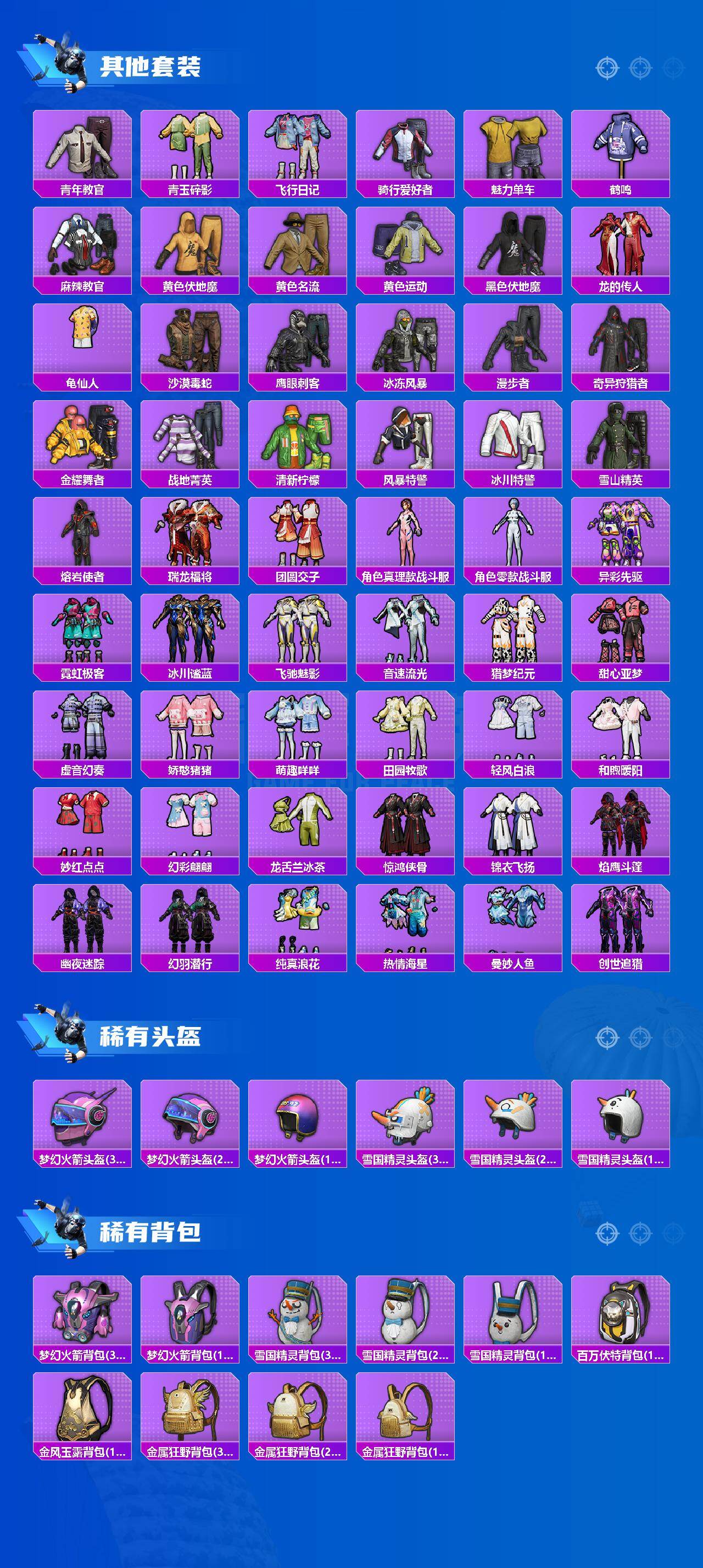 套装-雪国幻梦,套装-梦幻火箭,套装-派对舞王,套装-奇异狩猎者,角色-零号机款机体服,套装-闲梦青缨,套装-鹰眼刺客