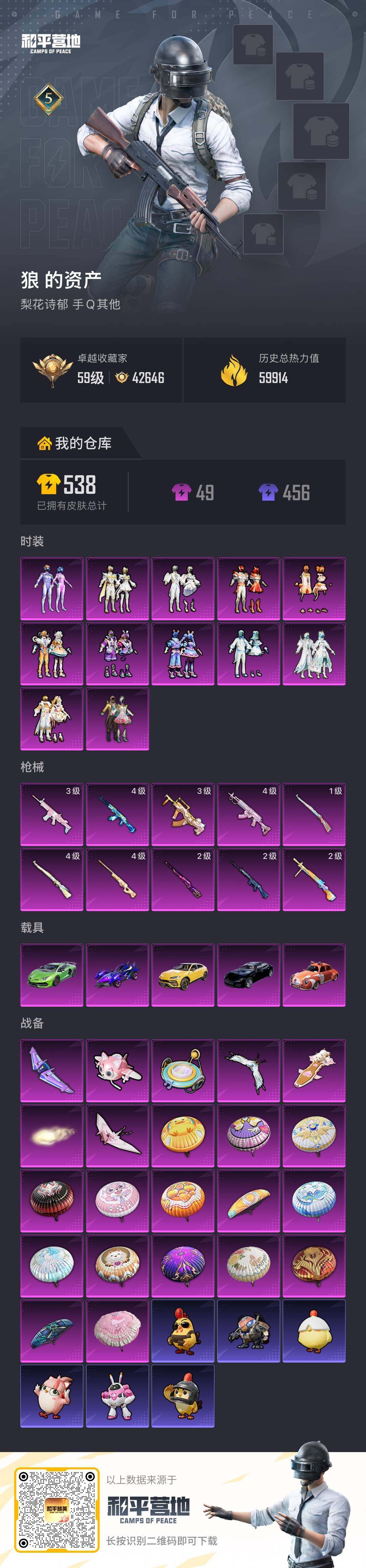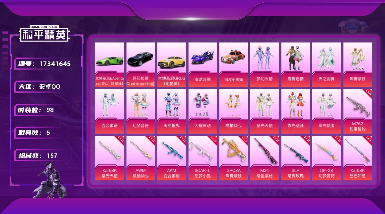 - PX_2095550- 安卓手Q-0王牌印记-2粉装-5特效枪-0载具-12498热力值-22套装-35枪皮-0卓越印记-0传奇印记 【2粉装】,冠军兔兔,脉冲星 【5特效枪】M416-电玩时刻-5级 GROZA-镜光银凌-5级 AUG-暖羊咩咩-5级 M762-电糖天使-5级 Kar98K-巳巳如意-5级 【2稀有紫装】,8号机,怀庆长公主, 【22稀有时装】,8号机,怀庆长公主,战术大师,巳