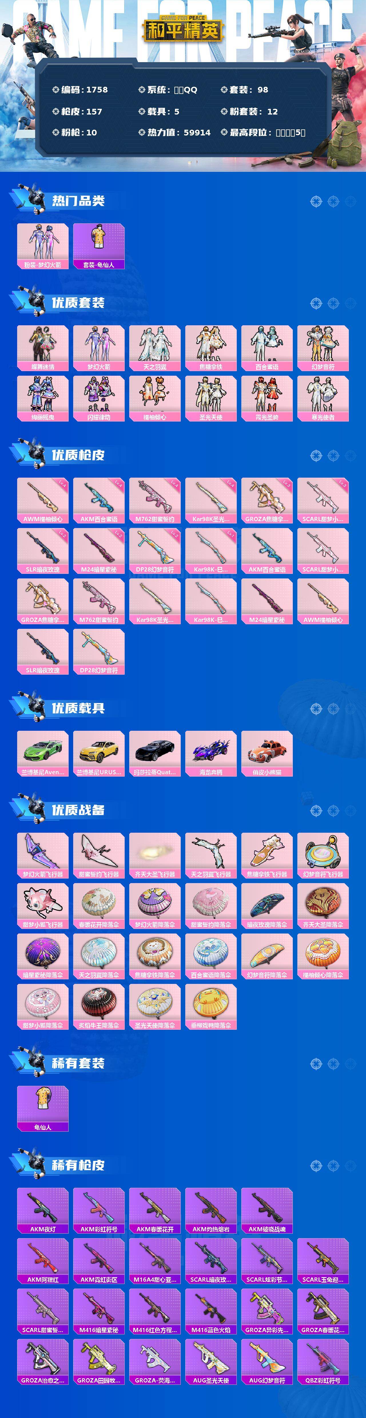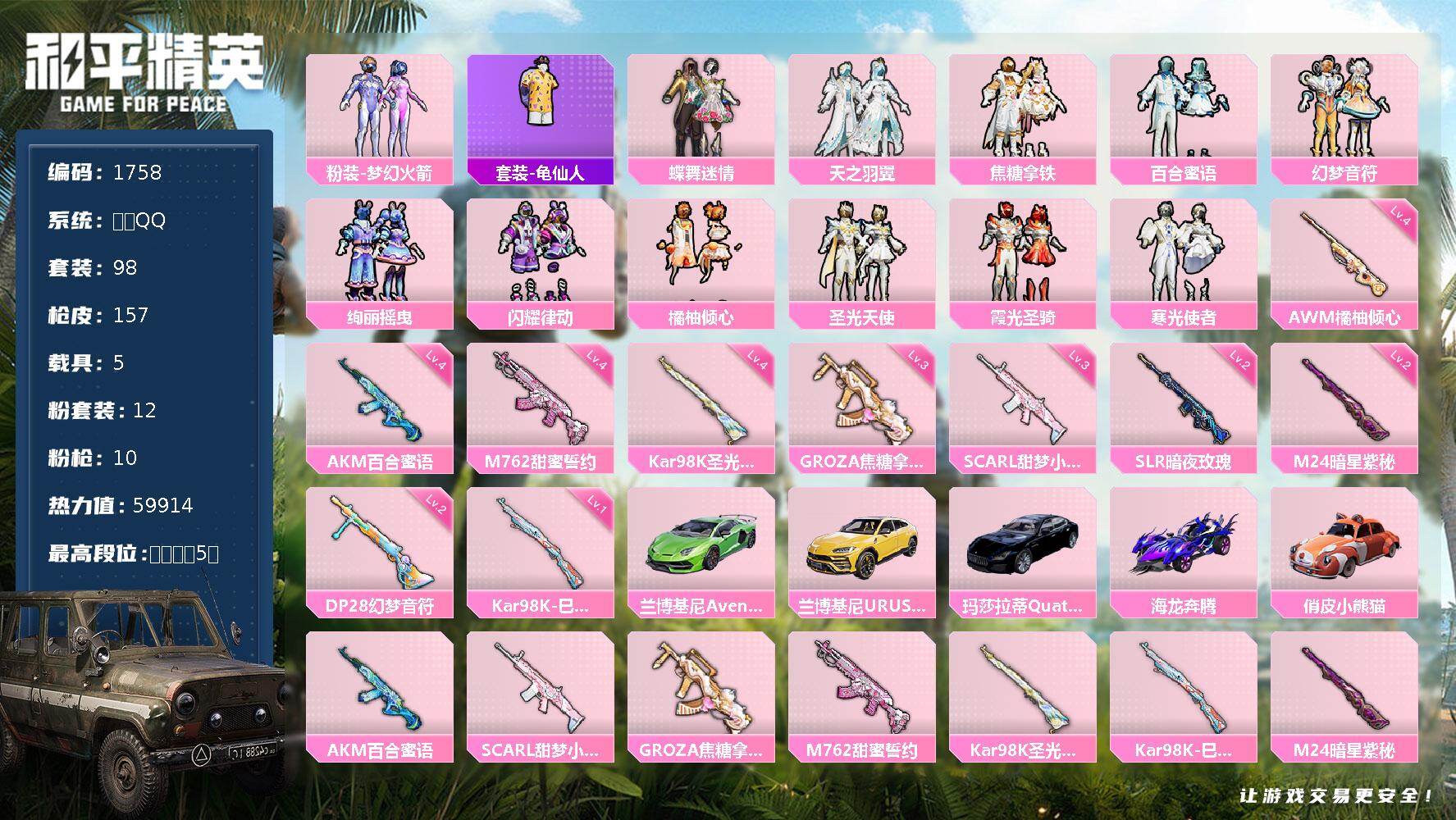 [17341645]【1758】安卓 手Q-12粉装-10特效枪-5载具-7粉色飞行器-59914热力值-5王牌印记-98套装-157枪皮 【热门品类】:粉装-梦幻火箭,套装-龟仙人 【粉色套装】:粉装-蝶舞迷情,粉装-梦幻火箭,粉装-天之羽翼,粉装-焦糖拿铁,粉装-百合蜜语,粉装-幻梦音符,粉装-绚丽摇曳,粉装-闪耀律动,粉装-橘柚倾心,粉装-圣光天使,粉装-霞光圣骑,粉装-寒光使者 【粉色枪皮等级】:AKM-百合蜜语(四级),SCAR-L-甜梦小狐(三级),GROZA-焦糖拿铁(三级),M762-甜蜜誓约(四级),Kar98K-圣光天使(四级),Kar98K-巳巳如意(一级),M24-暗星紫秘(二级),AWM-橘柚倾心(四级),SLR-暗夜玫瑰(二级),DP-28-幻梦音符(二级) 【粉色载具】:兰博基尼Aventador SVJ(翡翠绿),兰博基尼URUS(明艳黄),玛莎拉蒂Quattroporte(夜幕蓝),海龙奔腾,俏皮小熊猫 【粉色枪皮】:AKM-百合蜜语,SCAR-L-甜梦小狐,GROZA-焦糖拿铁,M762-甜蜜誓约,Kar98K-圣光天使,Kar98K-巳巳如意,M24-暗星紫秘,AWM-橘柚倾心,SLR-暗夜玫瑰,DP-28-幻梦音符 【粉色飞行器】:梦幻火箭飞行器,甜蜜誓约飞行器,齐天大圣飞行器,天之羽翼飞行器,焦糖拿铁飞行器,幻梦音符飞行器,甜梦小狐飞行器 【粉色降落伞】:春暖花开降落伞,梦幻火箭降落伞,甜蜜誓约降落伞,暗夜玫瑰降落伞,齐天大圣降落伞,暗星紫秘降落伞,天之羽翼降落伞,焦糖拿铁降落伞,百合蜜语降落伞,幻梦音符降落伞,橘柚倾心降落伞,甜梦小狐降落伞,炙焰牛王降落伞,圣光天使降落伞,垂柳戏鸭降落伞 【稀有套装】:套装-龟仙人 【稀有枪皮】:AKM-夜灯,AKM-彩虹符号,AKM-春暖花开,AKM-灼热熔岩,AKM-破晓战魂,AKM-虎虎生威,AKM-阿狸红,AKM-霓虹街区,M16A4-甜心亚梦,SCAR-L-暗夜玫瑰,SCAR-L-炫彩节奏,SCAR-L-玉兔迎春,SCAR-L-甜蜜誓约,M416-暗星紫秘,M416-红色方程式,M416-蓝色火焰,GROZA-异彩先驱,GROZA-春暖花开,GROZA-治愈之星,GROZA-田园牧歌,GROZA-荧海星豚,AUG-圣光天使,AUG-幻梦音符,QBZ-彩虹符号,QBZ-飞驰魅影,M762-天降萌叽,