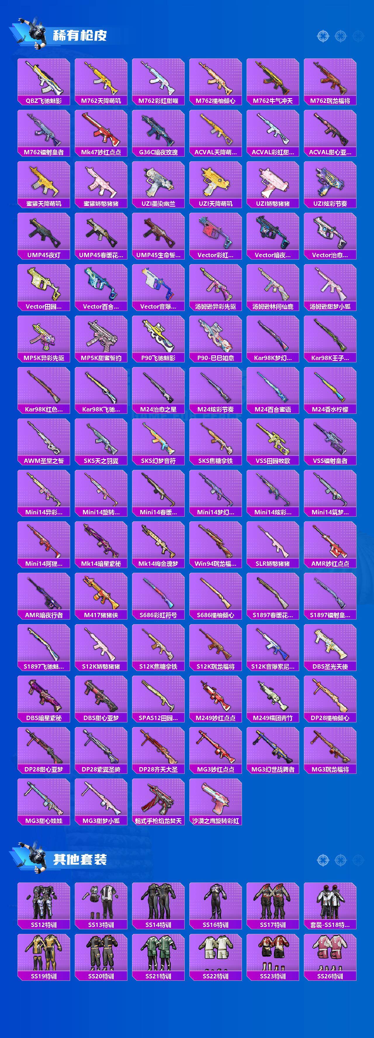 【稀有枪皮】:AKM-夜灯,AKM-彩虹符号,AKM-春暖花开,AKM-灼热熔岩,AKM-破晓战魂,AKM-虎虎生威,AKM-阿狸红,AKM-霓虹街区,M16A4-甜心亚梦,SCAR-L-暗夜玫瑰,SCAR-L-炫彩节奏,SCAR-L-玉兔迎春,SCAR-L-甜蜜誓约,M416-暗星紫秘,M416-红色方程式,M416-蓝色火焰,GROZA-异彩先驱,GROZA-春暖花开,GROZA-治愈之星,GROZA-田园牧歌,GROZA-荧海星豚,AUG-圣光天使,AUG-幻梦音符,QBZ-彩虹符号,QBZ-飞驰魅影,M762-天降萌叽,