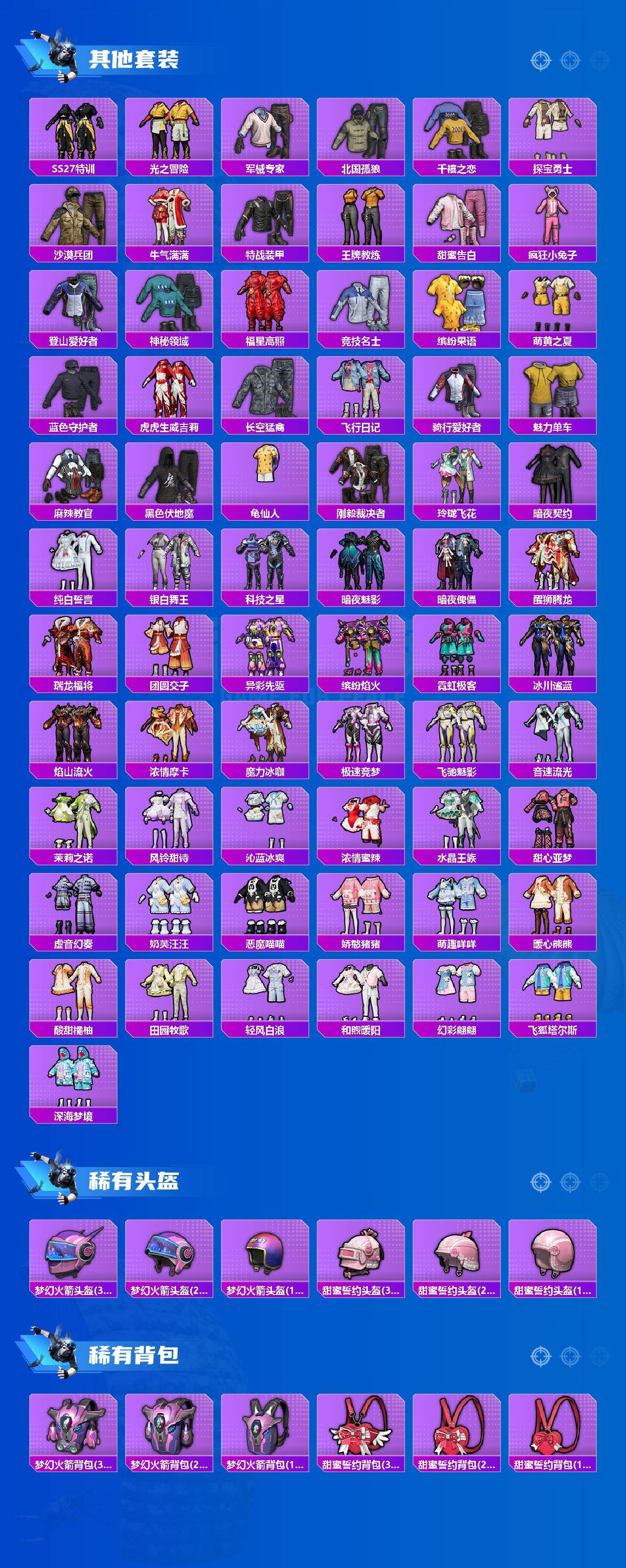 - [15632636]【特价出售/店主推荐】 苹果 微信-24粉装-4特效枪-1载具-3粉色飞行器-61599热力值-12王牌印记-131套装-156枪皮 【热门品类】:粉装-雪国幻梦,粉装-缤纷油彩,套装-冥河战士,套装-小丑鱼,套装-胖达团团,套装-胖达圆圆,套装-龟仙人,套装-萌熊伴侣,套装-糯粉咩咩,套装-红熊茄茄 【粉色套装】:粉装-雪国幻梦,粉装-智能音符,粉装-缤纷油彩,粉装-放客神游,粉装-星空之魅,粉装-绚金战神,粉装-馨动时刻,粉装-焦糖拿铁,粉装-岚岚物语,粉装-甜梦小狐,粉装-暖熊萌萌,粉装-绒雪飘舞,粉装-彩虹甜喵,粉装-冰川幽秘,粉装-寒光使者,角色-呆萌星弥,角色-白兰星,角色-宙之时溯,角色-星云暗核,粉装-莲影清波,角色-小叽联名款,角色-美雪,角色-美琪,粉装-金丰海韵 【粉色枪皮等级】:Kar98K-巳巳如意(五级),AWM-橘柚倾心(六级),M249-彩虹甜喵(七级),DP-28-豹影疾电(五级) 【粉色载具】:保时捷Panamera(星辰紫),僚机-萌兔起飞 【粉色枪皮】:Kar98K-巳巳如意,AWM-橘柚倾心,M249-彩虹甜喵,DP-28-豹影疾电 【粉色飞行器】:白勺歌姬飞行器,超新星飞行器 【粉色降落伞】:焦糖拿铁降落伞,恐龙拽拽降落伞,橘柚倾心降落伞,暖熊萌萌降落伞,彩虹甜喵降落伞,旋转彩虹降落伞,梦幻舞会降落伞,白勺歌姬降落伞,超新星降落伞,万古烈焰降落伞,小叽联名款降落伞,猪猪侠降落伞,金丰海韵降落伞,千金淑猫降落伞,月影灵韵降落伞,星穹咏叹调降落伞,炫彩糖果降落伞 【稀有套装】:套装-龟仙人,套装-巳巳如意,套装-雏菊兔兔,套装-萝兰蝴蝶,套装-小熊娃娃,套装-糖糖葫芦,套装-青团波波,套装-棉花软糖,角色-都市丽猫,套装-星影赞美诗,套装-云朵鹅,套装-雪绒豹,角色-绯色魅影,套装-炫彩糖果 【稀有枪皮】:AUG-冰晶雪宝,AKM-破晓战魂,AKM-霓虹街区,AKM-龙的传人,M16A4-冥河战士,M16A4-天使羽翼,SCAR-L-幽秘魅影,SCAR-L-炫彩节奏,M416-彩虹嘻嘻猴,GROZA-恐龙拽拽,GROZA-懵萌河马,GROZA-荧海星豚,AUG-圣光天使,QBZ-璀璨巨星,M762-彩虹甜喵,M762-彩虹符号,M762-暖熊萌萌,M762-甜心宝贝,M762-云朵鹅,G36C-懵萌河马,AC-VAL-彩虹甜