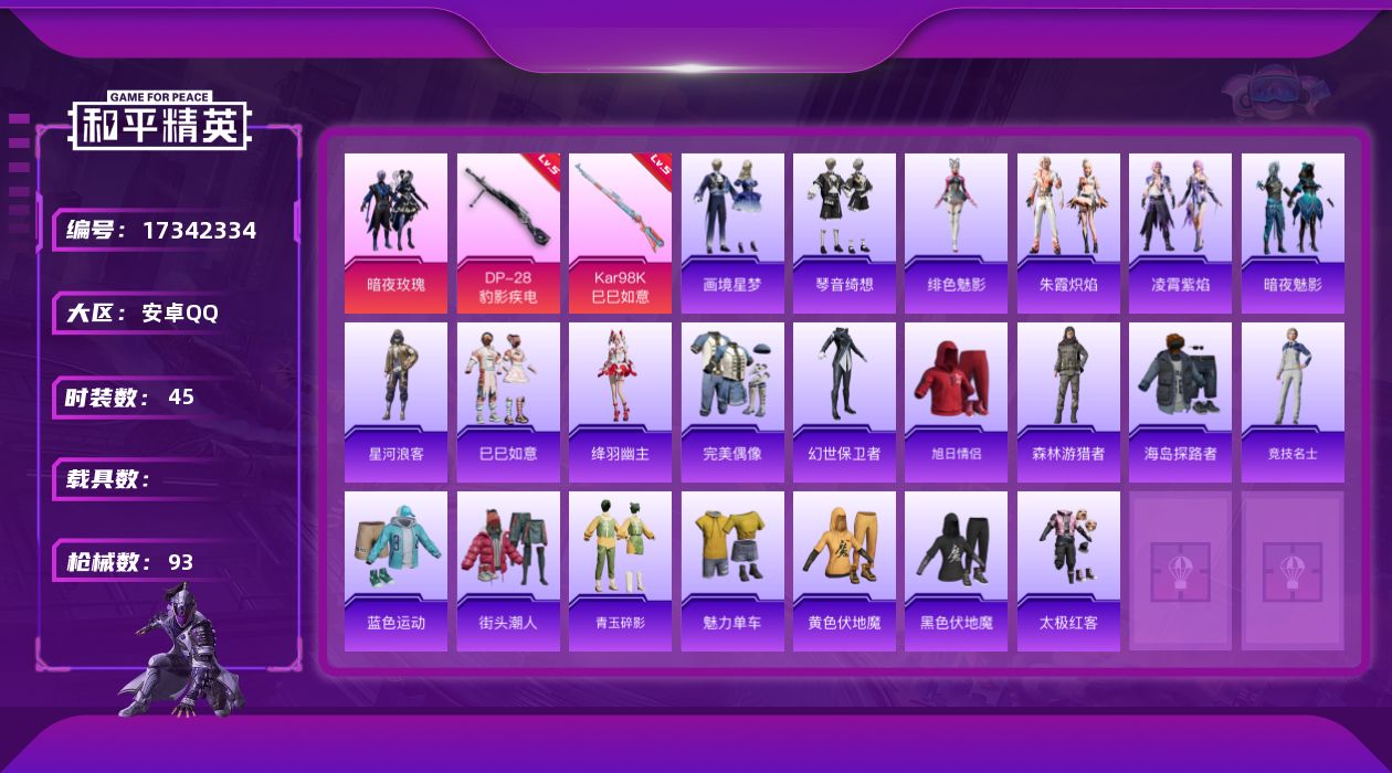 [17342334]安卓 手Q-1粉装-4特效枪-0载具-2粉色飞行器-22017热力值-1王牌印记-45套装-93枪皮 【热门品类】:套装-星河浪客 【粉色套装】:粉装-暗夜玫瑰 【粉色枪皮等级】:ACE32-萌骑漫游(二级),Kar98K-巳巳如意(五级),Mk14-福马献瑞(五级),DP-28-豹影疾电(五级) 【粉色枪皮】:ACE32-萌骑漫游,Kar98K-巳巳如意,Mk14-福马献瑞,DP-28-豹影疾电 【粉色飞行器】:炫彩糖果飞行器,桃源时光飞行器 【粉色降落伞】:绝对恒星降落伞,星之彼岸降落伞,环太平洋降落伞,荧海星豚降落伞,炫彩糖果降落伞 【稀有套装】:套装-巳巳如意,套装-炫彩糖果,套装-马上有钱,角色-绛羽幽主,套装-朱霞炽焰,套装-凌霄紫焰,角色-绯色魅影,套装-画境星梦,套装-琴音绮想,角色-曹焱兵 【稀有枪皮】:AKM-环太平洋,AKM-破晓战魂,M16A4-幻世战舞者,SCAR-L-夜灯,SCAR-L-炫彩节奏,SCAR-L-红色方程式,M416-红色方程式,M416-蓝色火焰,GROZA-影袭,AUG-耀粉歌者,QBZ-彩虹符号,AC-VAL-天降萌叽,蜜獾-绯穹魔姬,ACE32-画境星梦,ARX-凌霄紫焰,UZI-啾咪啾咪,UMP45-夜灯,UMP45-生命誓言,UMP45-蓝色火焰,汤姆逊-天降萌叽,汤姆逊-幻影战神,汤姆逊-环太平洋,MP5K-画境星梦,JS9-凌霄紫焰,P90-巳巳如意,Kar98K-幻影战神,Mini14-耀粉歌者,Mini14-绯穹魔姬,M1加兰德-画境星梦,S686-彩虹符号,S686-生命誓言,S686-巳巳如意,S1897-炫彩节奏,S12K-夜灯,AA12-G-画境星梦,M249-绯穹魔姬,MG3-幻世战舞者,MG-36-凌霄紫焰,P92-凌霄紫焰,突击盾牌-绝对恒星,大砍刀-鬼刀,平底锅-凌霄紫焰,平底锅-画境星梦,破片手榴弹-巳巳如意 【其他套装】:套装-完美偶像,套装-幻世保卫者,套装-旭日情侣,套装-森林游猎者,套装-海岛探路者,套装-竞技名士,套装-蓝色运动,套装-街头潮人,套装-青玉碎影,套装-魅力单车,套装-黄色伏地魔,套装-黑色伏地魔,套装-太极红客,套装-暗夜魅影 【稀有头盔】:深海小丑鱼头盔(1级) 【营地ID】:1032019881