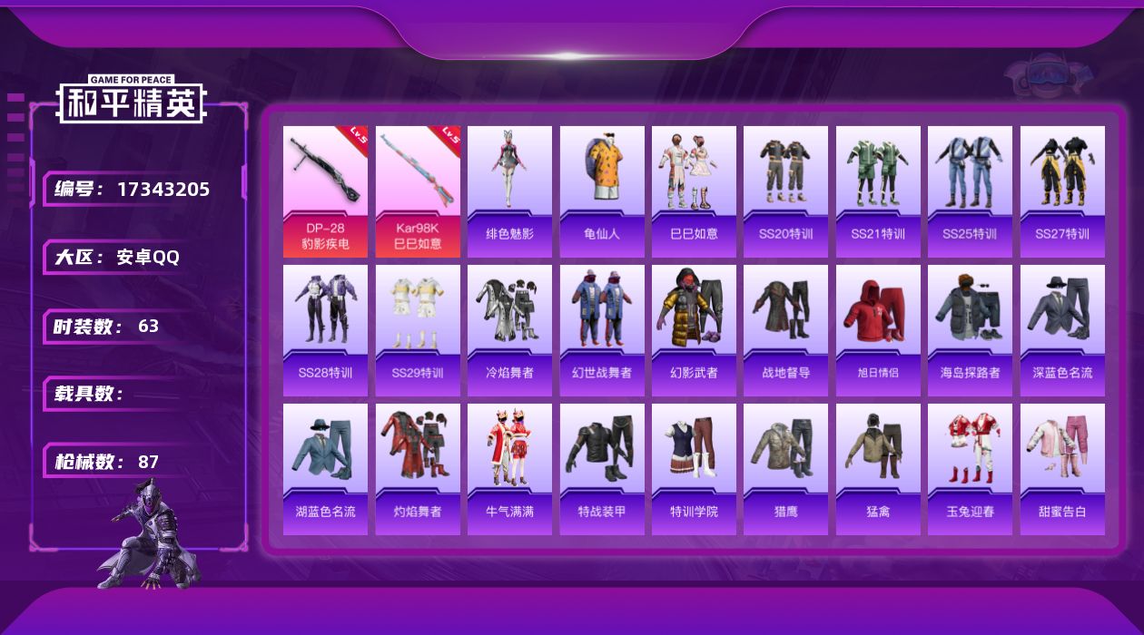 [17343205]安卓 手Q-1粉装-3特效枪-0载具-1粉色飞行器-21406热力值-2王牌印记-63套装-87枪皮 【热门品类】:套装-龟仙人 【粉色套装】:角色-虎痴许褚 【粉色枪皮等级】:Kar98K-巳巳如意(五级),Mk14-福马献瑞(五级),DP-28-豹影疾电(五级) 【粉色枪皮】:Kar98K-巳巳如意,Mk14-福马献瑞,DP-28-豹影疾电 【粉色飞行器】:炫彩糖果飞行器 【粉色降落伞】:垂柳戏鸭降落伞,喜羊羊与灰太狼降落伞,炫彩糖果降落伞 【稀有套装】:套装-龟仙人,套装-巳巳如意,套装-炫彩糖果,套装-马上来财,角色-绯色魅影 【稀有枪皮】:AUG-冰晶雪宝,AKM-龙的传人,SCAR-L-夜灯,SCAR-L-炫彩节奏,SCAR-L-玉兔迎春,M416-红色方程式,GROZA-影袭,AUG-天降萌叽,AUG-耀粉歌者,QBZ-彩虹符号,AC-VAL-天降萌叽,蜜獾-天降萌叽,UZI-天降萌叽,UZI-影袭,UZI-红色方程式,UMP45-夜灯,UMP45-春暖花开,UMP45-蓝色火焰,Vector-彩虹符号,汤姆逊-炫彩节奏,P90-巳巳如意,Kar98K-梦幻火箭,Kar98K-红色方程式,SKS-炫彩节奏,Mini14-耀粉歌者,S686-彩虹符号,S686-红色方程式,S686-巳巳如意,S12K-玩趣呆呆,S12K-破晓战魂,S12K-垂柳戏鸭,S12K-夜灯,S12K-幻世战舞者,DBS-彩虹符号,M249-破晓战魂,DP-28-彩虹符号,MG3-幻世战舞者,破片手榴弹-巳巳如意 【其他套装】:套装-SS20特训,套装-SS21特训,套装-SS25特训,套装-SS27特训,套装-SS28特训,套装-SS29特训,套装-冷焰舞者,套装-幻世战舞者,套装-幻影武者,套装-战地督导,套装-旭日情侣,套装-海岛探路者,套装-深蓝色名流,套装-湖蓝色名流,套装-灼焰舞者,套装-牛气满满,套装-特战装甲,套装-特训学院,套装-猎鹰,套装-猛禽,套装-玉兔迎春,套装-甜蜜告白,套装-白色伏地魔,套装-破晓战魂,套装-竞技名士,套装-红色运动,套装-耀粉歌者,套装-蓝色运动,套装-街头潮人,套装-酒红色名流,套装-长空猛禽,套装-青年教官,套装-青玉碎影,套装-魅力单车,套装-黄色伏地魔,套装-黄色名流,套装-黄色运动,套装-黑色伏地魔,套装-龙的传人,套装-