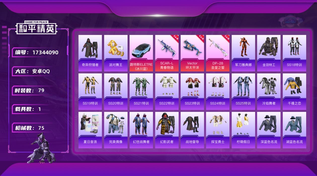 [17344090]安卓 手Q-0粉装-4特效枪-1载具-1粉色飞行器-29065热力值-5王牌印记-79套装-75枪皮 【热门品类】:套装-派对舞王,套装-奇异狩猎者,角色-军刀雅典娜,套装-金羽特工 【粉色枪皮等级】:SCAR-L-青春物语(四级),Vector-环太平洋(四级),Mk14-福马献瑞(五级),DP-28-圣堂之誓(四级) 【粉色载具】:路特斯ELETRE(冰川蓝) 【粉色枪皮】:SCAR-L-青春物语,Vector-环太平洋,Mk14-福马献瑞,DP-28-圣堂之誓 【粉色飞行器】:闪光银龙飞行器 【粉色降落伞】:星之彼岸降落伞,环太平洋降落伞,暖熊萌萌降落伞,垂柳戏鸭降落伞 【稀有套装】:套装-马上来财 【稀有枪皮】:AKM-彩虹符号,AKM-环太平洋,M16A4-幻世战舞者,M16A4-甜心亚梦,SCAR-L-炫彩节奏,SCAR-L-玉兔迎春,SCAR-L-红色方程式,M416-糯团青竹,M416-红色方程式,GROZA-青春物语,AUG-天降萌叽,AUG-怪笑疯兔,AUG-甜蜜菠萝,AUG-耀粉歌者,M762-天降萌叽,M762-奇异狩猎者,M762-暖熊萌萌,AC-VAL-天降萌叽,AC-VAL-甜心亚梦,蜜獾-天降萌叽,蜜獾-娇憨猪猪,UZI-娇憨猪猪,UMP45-夜灯,UMP45-生命誓言,UMP45-蓝色火焰,Vector-香水柠檬,汤姆逊-环太平洋,P90-飞驰魅影,Kar98K-炫彩节奏,Kar98K-红色方程式,M24-炫彩节奏,SKS-未来歌姬,Mini14-耀粉歌者,SLR-娇憨猪猪,MK20-H-莲影清波,S686-奇异狩猎者,S686-彩虹符号,S686-生命誓言,S1897-炫彩节奏,S12K-垂柳戏鸭,S12K-娇憨猪猪,S12K-幻世战舞者,S12K-暖熊萌萌,DBS-甜心亚梦,M249-彩虹符号,M249-月影鸳鸯,M249-莲影清波,DP-28-甜心亚梦,MG3-幻世战舞者,MG3-青春物语 【其他套装】:套装-SS18特训,套装-SS19特训,套装-SS20特训,套装-SS21特训,套装-SS22特训,套装-SS23特训,套装-SS24特训,套装-SS25特训,套装-冷焰舞者,套装-千禧之恋,套装-夏日音浪,套装-完美偶像,套装-幻世战舞者,套装-幻影武者,套装-战地督导,套装-探宝勇士,套装-柠萌假日,套装-深蓝色名流,套