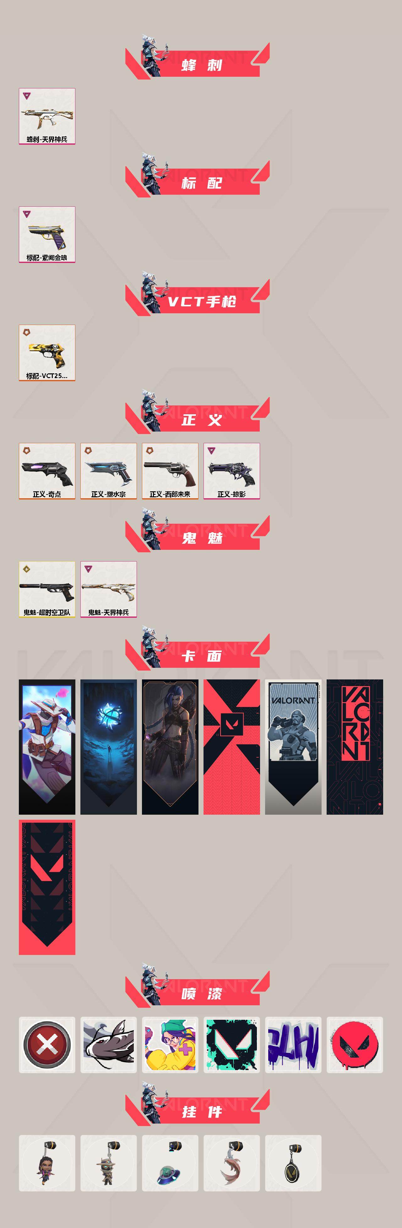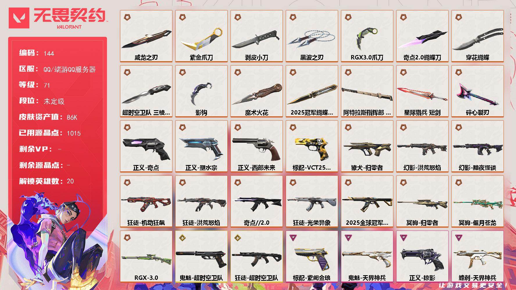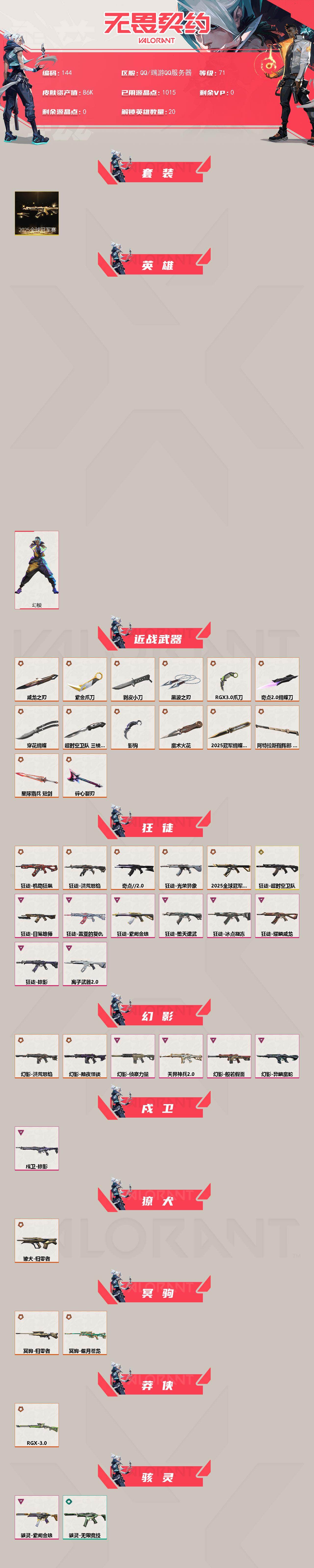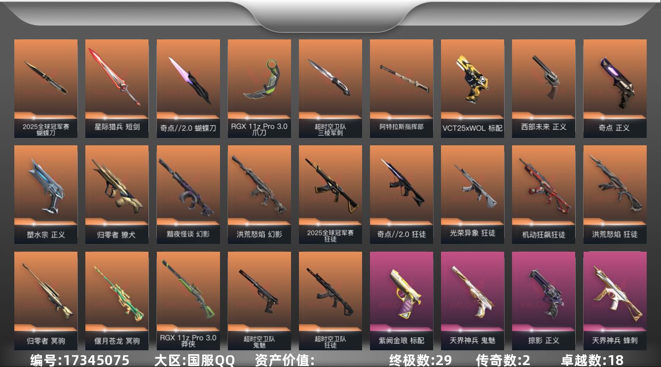 [17345075]【144】【套装】:2025全球冠军赛套装 【英雄】:幻棱,炼狱,维斯,暮蝶,钛狐,壹决,铁臂,捷风,不死鸟,贤者,猎枭,零,芮娜,奇乐,霓虹,斯凯,K/O,盖可,黑梦 【近战武器】:近战武器-2025全球冠军赛 蝴蝶刀,近战武器-碎心裂刃,近战武器-魔术火花,近战武器-影钩,近战武器-超时空卫队 三棱军刺,近战武器-穿花蝴蝶,近战武器-剥皮小刀,近战武器-奇点//2.0 蝴蝶刀,近战武器-紫金爪刀,近战武器-RGX 11z Pro//3.0 爪刀,近战武器-黑波之刃,近战武器-威龙之刃,近战武器-阿特拉斯指挥部 甩棍,近战武器-星际猎兵 短剑,近战武器-魔术火花 【狂徒】:狂徒-2025全球冠军赛,狂徒-洪荒怒焰,狂徒-机动狂飙,狂徒-奇点//2.0,狂徒-光荣异象,狂徒-超时空卫队,狂徒-冰点凝冻,狂徒-堕天遗武,狂徒-掠影,狂徒-盖亚的复仇,狂徒-日冕雄师,狂徒-耀鳞威龙,狂徒-紫阙金琅,狂徒-离子武器//2.0 【幻影】:幻影-黯夜怪谈,幻影-洪荒怒焰,幻影-般若假面,幻影-天界神兵//2.0,幻影-侦察力量,幻影-异鳞魔蛇 【戍卫】:戍卫-掠影 【獠犬】:獠犬-归零者 【冥驹】:冥驹-归零者,冥驹-偃月苍龙 【莽侠】:莽侠-RGX 11z Pro//3.0 【骇灵】:骇灵-紫阙金琅,骇灵-无限竞技 【蜂刺】:蜂刺-天界神兵 【标配】:标配-紫阙金琅 【VCT手枪】:标配-VCT25 x WOL 【正义】:正义-奇点,正义-塑水宗,正义-西部未来,正义-掠影 【鬼魅】:鬼魅-超时空卫队,鬼魅-天界神兵 【卡面】:无畏契约GO!第一卷:零 卡面,无垠星环 卡面,《双城之战》金克丝 卡面,代号红色 卡面,新兵报到 卡面,V契约 卡面,无畏契约 卡面 【喷漆】:买装还是存钱 喷漆,松叶 喷漆,无畏契约GO!第一卷:奇乐 喷漆,胜利属于无畏契约 喷漆,GLHF 喷漆,无畏契约 喷漆 【挂饰】:V25第六幕:神话 挂饰,无畏契约GO!第一卷 芮娜 挂饰,无畏契约GO!第一卷 零 挂饰,天外飞客 挂饰,红鳞松叶 挂饰,无畏契约 纪念币 挂饰