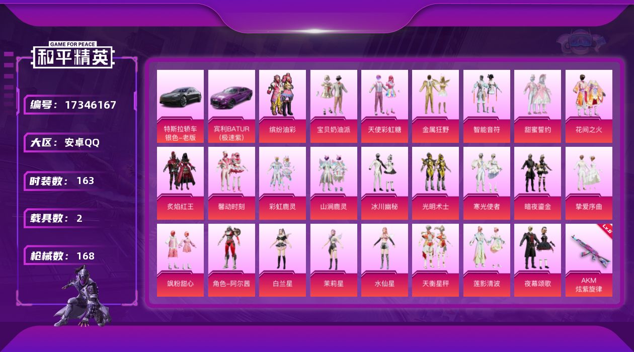 [17346167]【1132】安卓 手Q-24粉装-5特效枪-2载具-2粉色飞行器-65339热力值-5王牌印记-163套装-168枪皮 【热门品类】:粉装-缤纷油彩,套装-浪漫天命,角色-2B战斗服款,角色-2P战斗服款,套装-龟仙人,套装-潮萌小黄鸭,套装-浪漫波比 【粉色载具】:特斯拉Model 3(冷光银),宾利BATUR(极速紫),僚机-萌兔起飞 【粉色套装】:粉装-宝贝奶油派,粉装-天使彩虹糖,粉装-金属狂野,粉装-智能音符,粉装-缤纷油彩,粉装-甜蜜誓约,粉装-花间之火,粉装-炙焰红王,粉装-馨动时刻,粉装-彩虹鹿灵,粉装-山涧鹿灵,粉装-冰川幽秘,粉装-光明术士,粉装-寒光使者,粉装-暗夜鎏金,粉装-挚爱序曲,粉装-飒粉甜心,角色-阿尔茜,角色-白兰星,角色-茉莉星,角色-水仙星,粉装-天衡星秤,粉装-莲影清波,粉装-夜幕颂歌 【粉色枪皮等级】:AKM-炫紫旋律(六级),AUG-超新星(五级),M762-甜蜜誓约(四级),SPAS-12-音爆索尼克(二级),DP-28-暗夜鎏金(四级) 【粉色枪皮】:AKM-炫紫旋律,AUG-超新星,M762-甜蜜誓约,SPAS-12-音爆索尼克,DP-28-暗夜鎏金 【粉色飞行器】:变形金刚飞行器,粉樱探戈飞行器 【粉色降落伞】:甜心宝贝降落伞,春暖花开降落伞,炫紫旋律降落伞,童趣迷兔降落伞,林间仙鹿降落伞,圣光天使降落伞,彩虹甜喵降落伞,暗夜鎏金降落伞,音爆索尼克降落伞,未来歌姬降落伞,闲梦青缨降落伞,莲影清波降落伞,圣堂之誓降落伞,夜幕颂歌降落伞,祥瑞锦鲤降落伞 【稀有套装】:套装-龟仙人 【稀有枪皮】:AKM-2P战斗服款,AKM-彩虹符号,AKM-破晓战魂,AKM-霓虹街区,AKM-龙的传人,M16A4-快乐主宰,M16A4-莲影清波,SCAR-L-玉兔迎春,SCAR-L-红色方程式,M416-夜灯,M416-糯团青竹,M416-红色方程式,M416-罗小黑,GROZA-2B战斗服款,GROZA-懵萌河马,GROZA-林间仙鹿,GROZA-田园牧歌,GROZA-黑色刀锋,AUG-天降萌叽,AUG-耀粉歌者,AUG-魔法学院,QBZ-未来歌姬,QBZ-神秘黑猫,M762-天降萌叽,M762-拳皇97,M762-暖熊萌萌,M762-暗夜鎏金,M762-深海曼妙,M762-牛气冲天,M762-甜心宝贝,M762-第五大道,Mk4