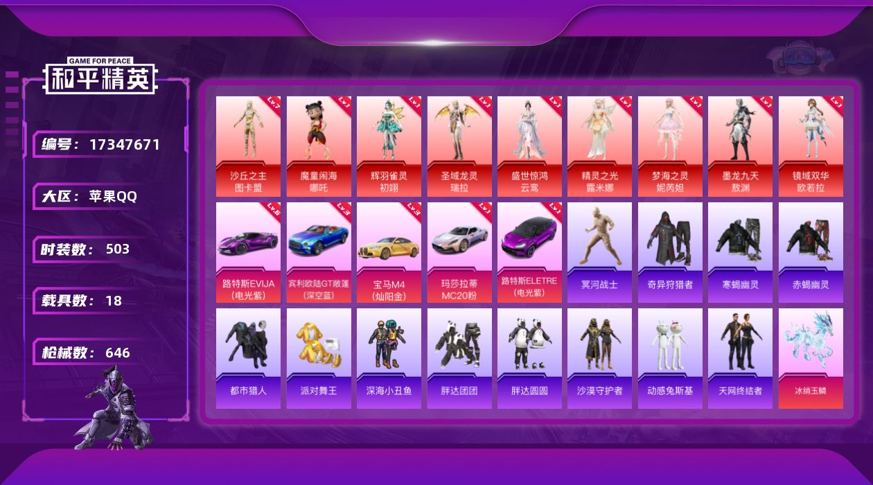 [17347671]【1613】苹果 手Q-无敌战神框-9神装-106粉装-81特效枪-18载具-36粉色飞行器-360958热力值-25王牌印记-503套装-646枪皮 【红色载具】:路特斯ELETRE(电光紫)(一级),路特斯EVIJA(电光紫)(六级),玛莎拉蒂MC20(幻星粉)(一级),宾利欧陆GT敞篷(深空蓝)(三级),宝马M4(灿阳金)(三级) 【红色神装等级】:魔童闹海-哪吒(一级),辉羽雀灵-初翊(一级),圣域龙灵-瑞拉(一级),盛世惊鸿-云鸾(一级),精灵之光-露米娜(一级),梦海之灵-妮芮妲(一级),墨龙九天-敖渊(一级),镜域双华-欧若拉(一级),沙丘之主-图卡盟(七级) 【红色角色神装】:魔童闹海-哪吒,辉羽雀灵-初翊,圣域龙灵-瑞拉,盛世惊鸿-云鸾,精灵之光-露米娜,梦海之灵-妮芮妲,墨龙九天-敖渊,镜域双华-欧若拉,沙丘之主-图卡盟 【热门品类】:粉装-怪诞乔克,粉装-雪国幻梦,粉装-梦幻火箭,粉装-童趣迷兔,粉装-缤纷油彩,粉装-繁龙极客,套装-寒蝎幽灵,套装-浪漫天命,套装-赤蝎幽灵,套装-都市猎人,套装-冥河战士,套装-派对舞王,套装-深海小丑鱼,套装-小丑鱼,套装-奇异狩猎者,套装-胖达团团,套装-胖达圆圆,套装-天网终结者,套装-金羽特工,套装-沙漠守护者,套装-忍者信条,套装-动感兔斯基人偶服,套装-AG战队服,角色-忠义严颜,套装-暗夜之虎,套装-龟仙人,套装-潮萌小黄鸭,套装-暗影哥特,套装-浪漫波比,套装-粉红小猪,套装-糯粉咩咩,套装-软软马卡龙,M416-星际漫游,大砍刀-青龙偃月刀,撬棍-龙胆亮银枪,师父专用外套,套装-红熊茄茄 【粉色载具】:路特斯EVIJA(电光紫),路特斯ELETRE(电光紫),玛莎拉蒂MC20(幻星粉),玛莎拉蒂Ghibli(金),宾利欧陆GT敞篷(深空蓝),宝马M4(灿阳金),合金龙骨(红),双人摩托-梦幻火箭,疾风龙骑,盛世惊鸿摩托车,鬼马风驰,空客H135-恋语之翼,僚机-萌兔起飞,赤兔,照夜玉狮子,星梦玉骢,护世瑞兽,晶梦灵驹,冰绡玉鳞,辉羽雀灵自行车 【粉色套装】:粉装-深海曼妙,粉装-独舞天鹅,粉装-极限特训,粉装-星际漫游者,粉装-粉色回忆,粉装-怪诞乔克,粉装-甜心巧克力,粉装-宝贝奶油派,粉装-天使彩虹糖,粉装-雪国幻梦,粉装-蝶舞迷情,粉装-梦幻火箭,粉装-星之信仰,粉装-金属狂野,粉装-