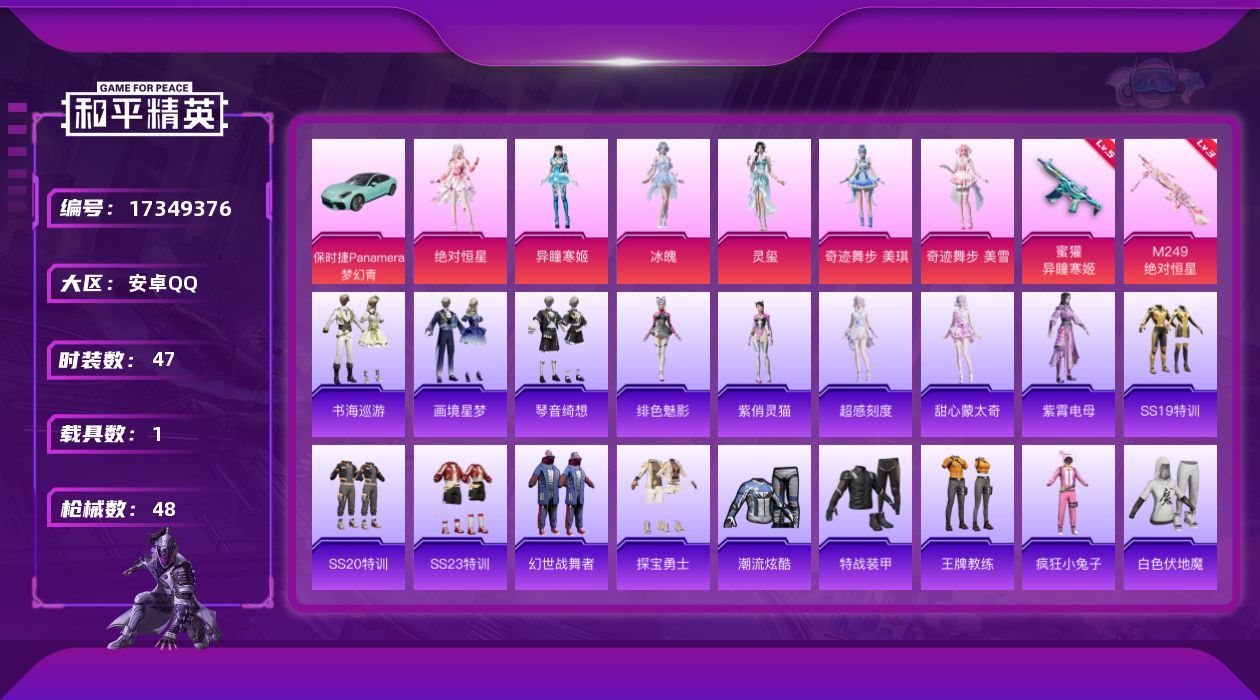 [17349376]安卓 手Q-7粉装-4特效枪-1载具-5粉色飞行器-19970热力值-5王牌印记-47套装-48枪皮 【粉色套装】:角色-绝对恒星,角色-奇迹舞步 美琪,角色-奇迹舞步 美雪,角色-冰魄,角色-灵玺,角色-异瞳寒姬,角色-罪夜之冕 【粉色枪皮等级】:AUG-罪夜之冕(四级),蜜獾-异瞳寒姬(五级),Mk14-福马献瑞(三级),M249-绝对恒星(三级) 【粉色载具】:保时捷Panamera(梦幻青) 【粉色枪皮】:AUG-罪夜之冕,蜜獾-异瞳寒姬,Mk14-福马献瑞,M249-绝对恒星 【粉色飞行器】:绝对恒星飞行器,炫彩糖果飞行器,奇迹舞步飞行器,天象三御飞行器,极意拳锋飞行器 【粉色降落伞】:绝对恒星降落伞,奇迹舞步降落伞,无垠阁降落伞,异瞳寒姬降落伞,炫彩糖果降落伞,罪夜之冕降落伞 【稀有套装】:角色-超感刻度,角色-甜心蒙太奇,套装-雪国风尚,套装-炫彩糖果,套装-马上来财,角色-绯色魅影,角色-紫俏灵猫,角色-紫霄电母,套装-书海巡游,套装-画境星梦,套装-琴音绮想,角色-霜刃之御,角色-月烬之祷,角色-杯旋调茶师,角色-霜纹水星 【稀有枪皮】:AKM-灼热熔岩,SCAR-L-炫彩节奏,M416-蓝色火焰,AUG-绝对恒星,ACE32-画境星梦,UZI-炫彩节奏,UMP45-蓝色火焰,UMP45-极意拳锋,汤姆逊-天降萌叽,MP5K-画境星梦,AWM-奇迹舞步,SKS-炫彩节奏,M200-无垠阁,M1加兰德-画境星梦,AA12-G-画境星梦,MG3-幻世战舞者,信号枪-奇迹舞步,突击盾牌-绝对恒星,平底锅-无垠阁,平底锅-画境星梦 【其他套装】:套装-SS19特训,套装-SS20特训,套装-SS23特训,套装-幻世战舞者,套装-探宝勇士,套装-潮流炫酷,套装-特战装甲,套装-王牌教练,套装-疯狂小兔子,套装-白色伏地魔,套装-破蛋小黄鸡,套装-竞技名士,套装-蓝色运动,套装-都市漫游者,套装-长空猛禽 【营地ID】:906193293