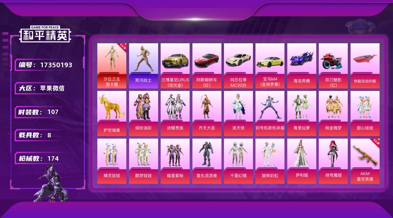 [17350193]【店主推荐捡漏号!可直接换绑】苹果 微信-1神装-16粉装-14特效枪-8载具-12粉色飞行器-78829热力值-12王牌印记-107套装-174枪皮【红色神装等级】:沙丘之主-图卡盟(三级)【红色角色神装】:沙丘之主-图卡盟【热门品类】:粉装-缤纷油彩,套装-冥河战士,角色-军刀雅典娜【粉色套装】:粉装-缤纷油彩,粉装-迷蝶贵族,粉装-齐天大圣,角色-洛天依,角色-初号机款机体服,粉装-青葱仙萝,粉装-绚金瑰梦,粉装-甜心娃娃,粉装-精灵娃娃,粉装-酣梦娃娃,粉装-暗星紫秘,角色-复仇流浪者,粉装-千面幻镜,粉装-旋转彩虹,角色-萨利娅,角色-绯穹魔姬【粉色枪皮等级】:AKM-盖世英雄(八级),AKM-幽焰骑士(一级),M416-女娲灵识(四级),GROZA-镜光银凌(五级),AUG-许七安(五级),M762-甜心娃娃(七级),蜜獾-荧海星豚(二级),ARX-无垠阁(三级),P90-沙丘之主(三级),Kar98K-巳巳如意(五级),M24-暗星紫秘(一级),AMR-炫光之旅(二级),DP-28-豹影疾电(四级),MG3-洛神天依(五级)【粉色载具】:兰博基尼URUS(炫光金),阿斯顿马丁DBS(红),玛莎拉蒂MC20(星石白),宝马M4(圣保罗黄),海龙奔腾,双人摩托-双刃魅影(红),快艇-自由的鲸,护世瑞兽【粉色枪皮】:AKM-盖世英雄,AKM-幽焰骑士,M416-女娲灵识,GROZA-镜光银凌,AUG-许七安,M762-甜心娃娃,蜜獾-荧海星豚,ARX-无垠阁,P90-沙丘之主,Kar98K-巳巳如意,M24-暗星紫秘,AMR-炫光之旅,DP-28-豹影疾电,MG3-洛神天依【粉色飞行器】:酣梦熊熊飞行器,祥瑞起舞飞行器,荧光虫舞飞行器,齐天大圣飞行器,绿意幻情飞行器,千面幻镜飞行器,沙丘之主天马,镜域双华-灵镜之阶,龙翔九天飞行器,幽焰列车飞行器,万象金身飞行器,灵猫魔法师飞行器