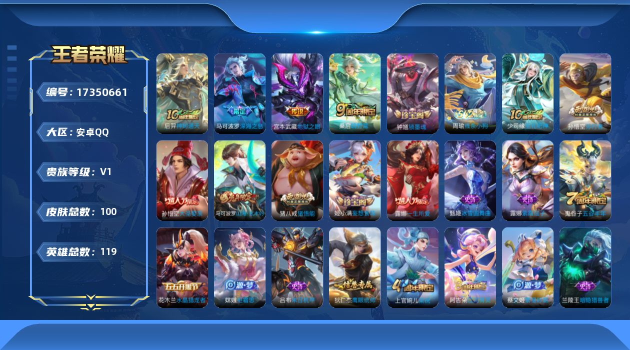 [17350661]安卓Q-V1-荣耀黄金I段位-119英雄-100皮肤-4传说-27史诗