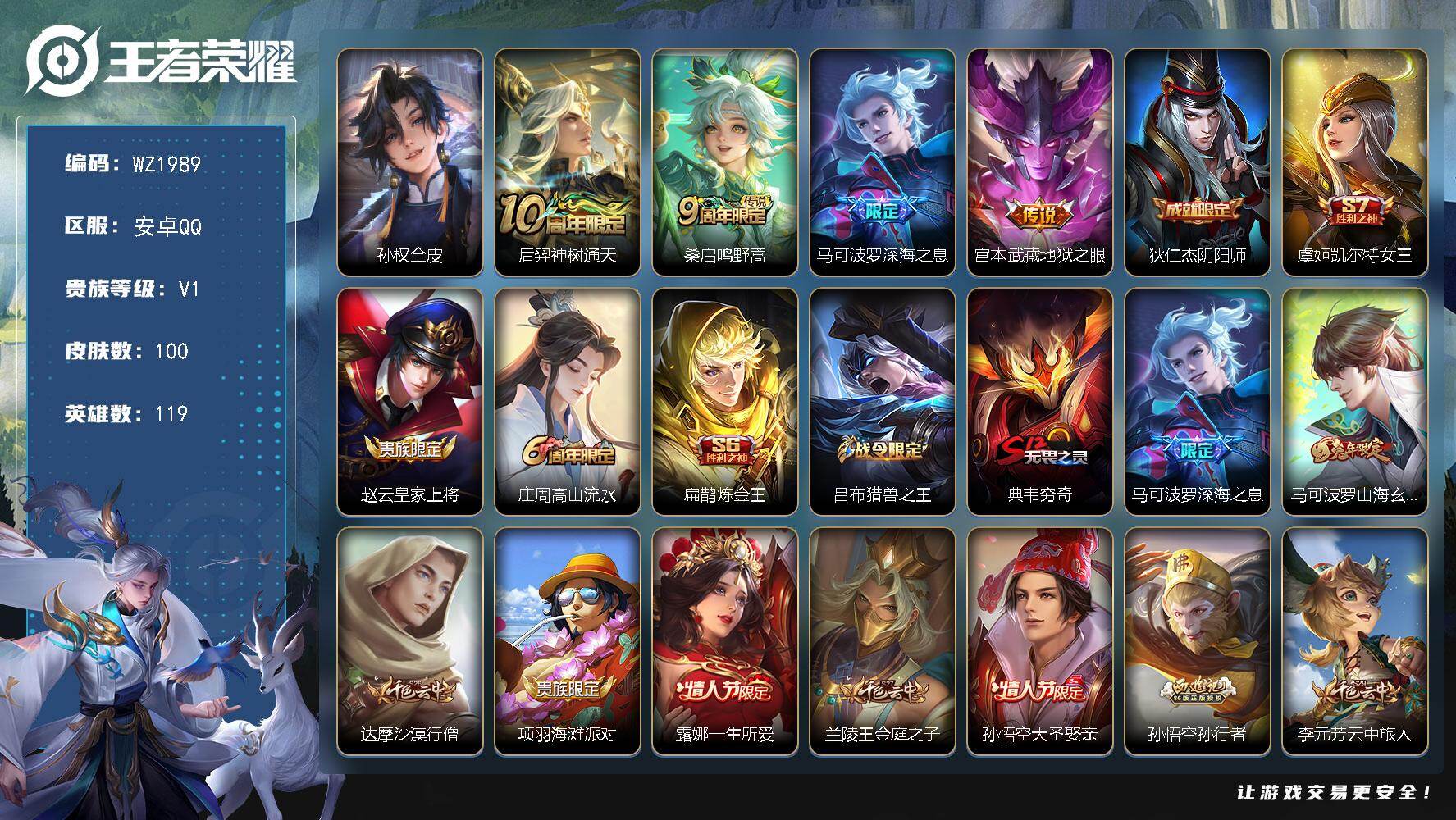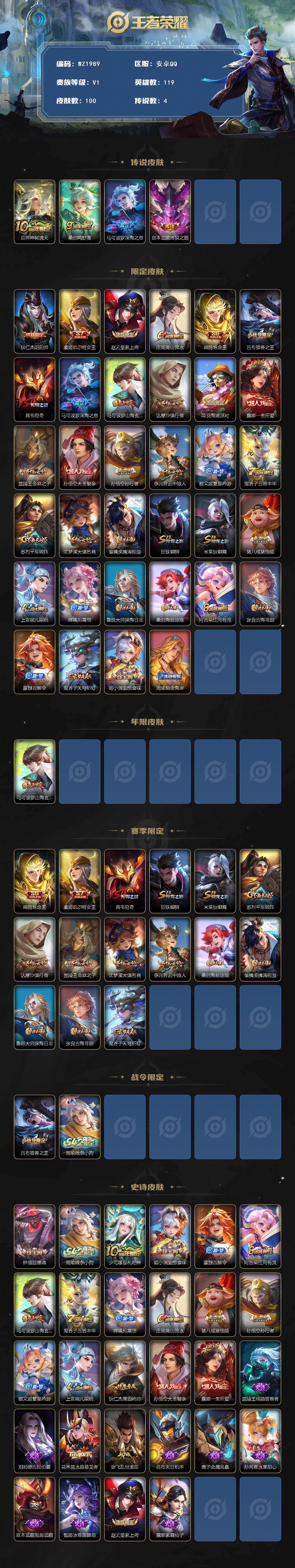 [17350661]安卓Q-V1-荣耀黄金I段位-119英雄-100皮肤-4传说-27史诗 【英雄全皮】:孙权全皮 【传说皮肤】:后羿神树通天,桑启鸣野蒿,马可波罗深海之息,宫本武藏地狱之眼 【限定皮肤】:狄仁杰阴阳师,虞姬凯尔特女王,赵云皇家上将,庄周高山流水,扁鹊炼金王,吕布猎兽之王,典韦穷奇,马可波罗深海之息,马可波罗山海玄木吟,达摩沙漠行僧,项羽海滩派对,露娜一生所爱,兰陵王金庭之子,孙悟空大圣娶亲,孙悟空孙行者,李元芳云中旅人,蔡文姬繁星吟游,鬼谷子五谷丰年,苏烈千军破阵,沈梦溪大漠名商,裴擒虎擒涛扼浪,狂铁御狮,米莱狄御霄,猪八戒猪悟能,上官婉儿梁祝,嫦娥拒霜思,鲁班大师探海日志,桑启海盐诗旅,阿古朵江河有灵,张良古海寻踪,蒙犽百解令,鬼谷子天穹祈灯,姬小满妄想食味,周瑜熔金海岸 【年限皮肤】:马可波罗山海玄木吟 【赛季限定】:扁鹊炼金王,虞姬凯尔特女王,典韦穷奇,狂铁御狮,米莱狄御霄,苏烈千军破阵,达摩沙漠行僧,兰陵王金庭之子,沈梦溪大漠名商,李元芳云中旅人,桑启海盐诗旅,裴擒虎擒涛扼浪,鲁班大师探海日志,张良古海寻踪,鬼谷子天穹祈灯 【战令限定】:吕布猎兽之王,周瑜线条小狗 【史诗皮肤】:钟馗锁墨魂,周瑜线条小狗,少司缘巫礼祀神,姬小满妄想食味,蒙犽百解令,阿古朵江河有灵,马可波罗山海玄木吟,鬼谷子五谷丰年,嫦娥拒霜思,庄周高山流水,猪八戒猪悟能,孙悟空孙行者,蔡文姬繁星吟游,上官婉儿梁祝,狄仁杰鹰眼统帅,孙悟空大圣娶亲,露娜一生所爱,兰陵王暗隐猎兽者,刘邦德古拉伯爵,花木兰水晶猎龙者,张飞乱世虎臣,吕布末日机甲,墨子金属风暴,孙尚香水果甜心,宫本武藏鬼剑武藏,甄姬冰雪圆舞曲,赵云皇家上将,露娜紫霞仙子 【其他皮肤】:蚩奼极光幻客,艾琳鹤鸣心笺,孙权径山谋武,露娜命运加冕,周瑜熔金海岸,鬼谷子天穹祈灯,后羿完美运算,张良古海寻踪,李元芳妄想特派,姬小满零食大作战,鲁班大师探海日志,裴擒虎擒涛扼浪,桑启海盐诗旅,李元芳云中旅人,蒙恬蔚蓝守将,沈梦溪大漠名商,兰陵王金庭之子,达摩沙漠行僧,苏烈千军破阵,吕布猎兽之王,米莱狄御霄,狂铁御狮,典韦穷奇,牛魔制霸全明星,狂铁命运角斗场,钟无艳海滩丽影,墨子进击墨子号,虞姬凯尔特女王,扁鹊炼金王,狄仁杰阴阳师,刘备万事如意,张飞五福同心,花木兰兔女郎,达摩拳王,妲己少女阿狸,宫本武藏未来纪元,扁鹊化身博士,牛魔西部大镖客,白起白色