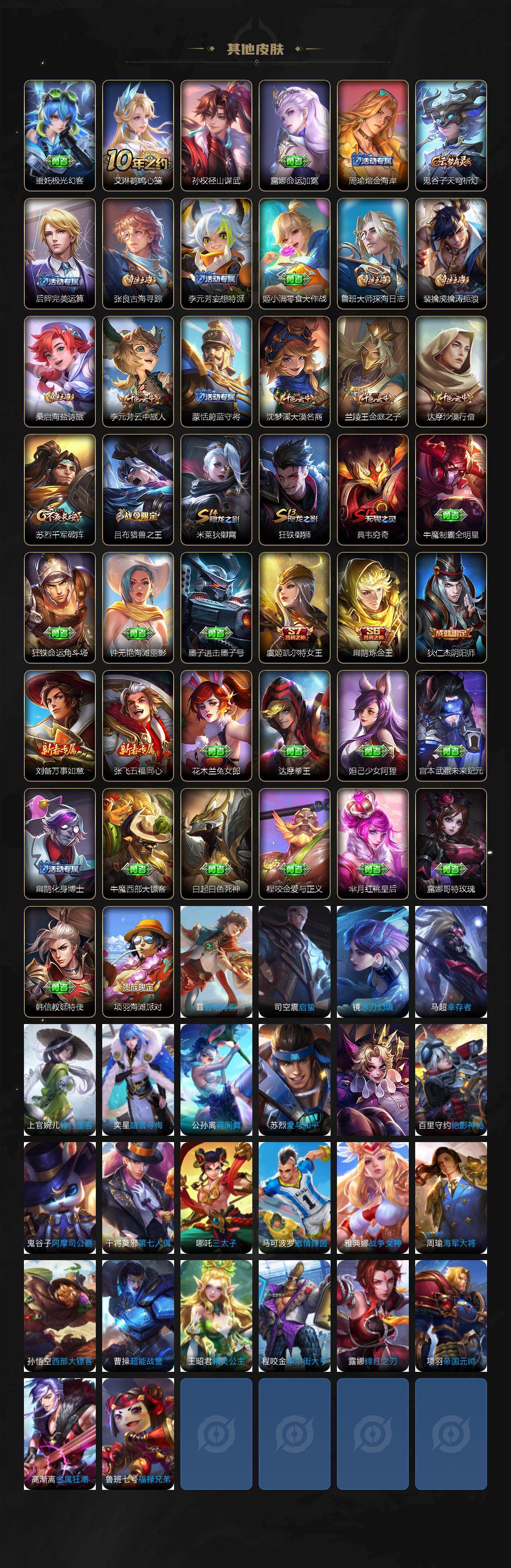 【限定皮肤】:狄仁杰阴阳师,虞姬凯尔特女王,赵云皇家上将,庄周高山流水,扁鹊炼金王,吕布猎兽之王,典韦穷奇,马可波罗深海之息,马可波罗山海玄木吟,达摩沙漠行僧,项羽海滩派对,露娜一生所爱,兰陵王金庭之子,孙悟空大圣娶亲,孙悟空孙行者,李元芳云中旅人,蔡文姬繁星吟游,鬼谷子五谷丰年,苏烈千军破阵,沈梦溪大漠名商,裴擒虎擒涛扼浪,狂铁御狮,米莱狄御霄,猪八戒猪悟能,上官婉儿梁祝,嫦娥拒霜思,鲁班大师探海日志,桑启海盐诗旅,阿古朵江河有灵,张良古海寻踪,蒙犽百解令,鬼谷子天穹祈灯,姬小满妄想食味,周瑜熔金海岸