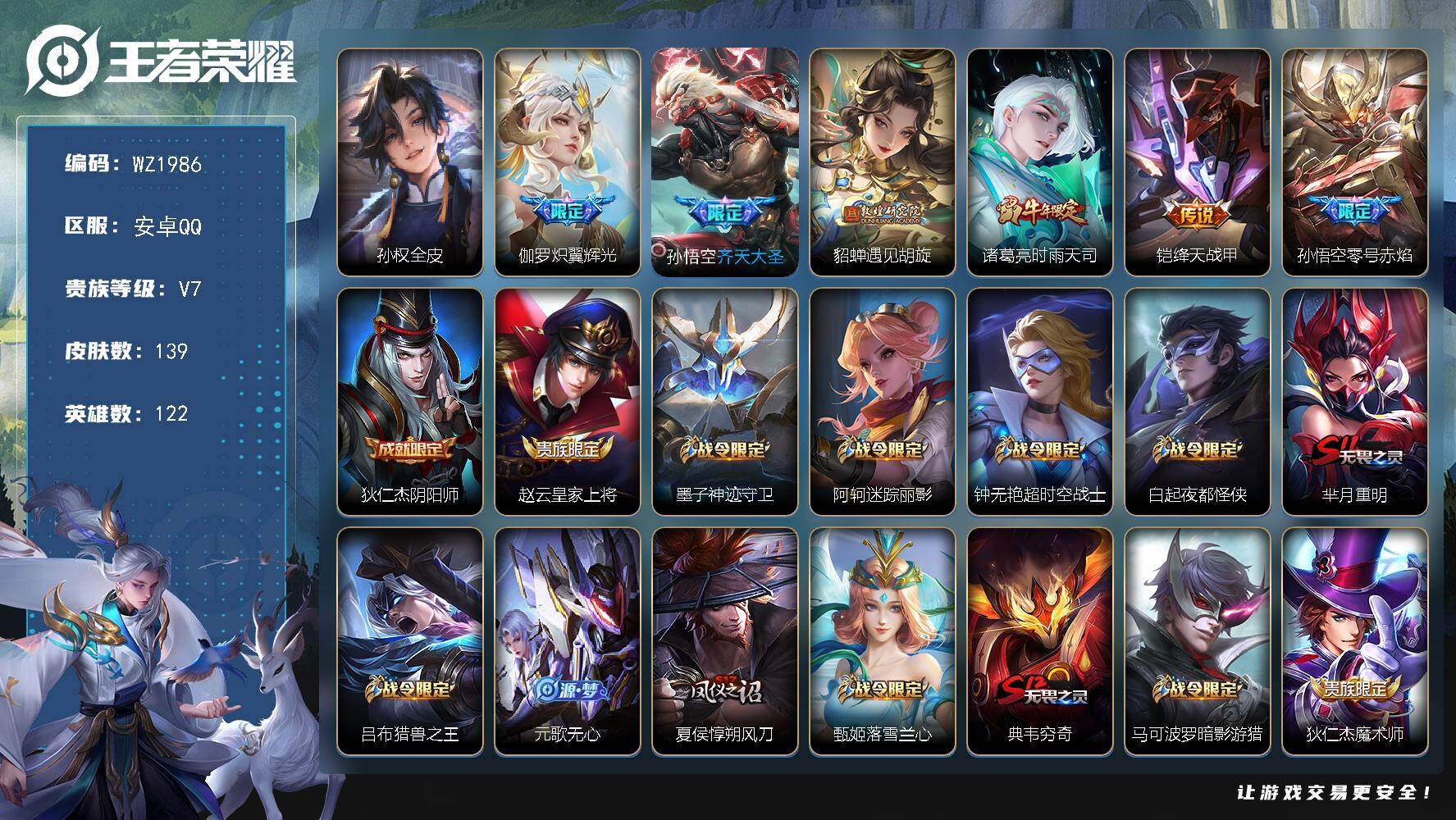 [17350873]安卓Q-139皮肤-6传说-26史诗 【英雄全皮】:孙权全皮 【传说皮肤】:伽罗炽翼辉光,孙悟空齐天大圣,貂蝉遇见胡旋,诸葛亮时雨天司,铠绛天战甲,孙悟空零号赤焰 【限定皮肤】:狄仁杰阴阳师,赵云皇家上将,墨子神迹守卫,阿轲迷踪丽影,钟无艳超时空战士,白起夜都怪侠,芈月重明,吕布猎兽之王,元歌无心,夏侯惇朔风刀,甄姬落雪兰心,典韦穷奇,马可波罗暗影游猎,狄仁杰魔术师,狄仁杰万华元夜,达摩星际陆战队,达摩沙漠行僧,项羽海滩派对,老夫子醍醐杖,老夫子航海奇遇记,貂蝉遇见胡旋,程咬金演武夺筹,刘邦夺宝奇兵,王昭君午后时光,兰陵王金庭之子,孙悟空大圣娶亲,孙悟空零号赤焰,孙悟空齐天大圣,牛魔御旌,李元芳云中旅人,钟馗驱傩正仪,杨戬潮玩骑兵,雅典娜单词大作战,鬼谷子原初探秘者,鬼谷子五谷丰年,诸葛亮时雨天司,铠青龙志,弈星混沌棋,沈梦溪大漠名商,明世隐疑决卦,裴擒虎李小龙,裴擒虎擒涛扼浪,狂铁御狮,狂铁电玩高手,米莱狄御霄,伽罗天狼溯光者,伽罗炽翼辉光,盾山御銮,猪八戒西部大镖客,嫦娥暖冬兔眠,蒙犽狂想玩偶喵,鲁班大师探海日志,桑启海盐诗旅,暃星界游侠,艾琳女武神 【年限皮肤】:铠青龙志,诸葛亮时雨天司 【赛季限定】:芈月重明,典韦穷奇,狂铁御狮,米莱狄御霄,牛魔御旌,盾山御銮,夏侯惇朔风刀,弈星混沌棋,明世隐疑决卦,老夫子醍醐杖,鬼谷子原初探秘者,狄仁杰万华元夜,程咬金演武夺筹,钟馗驱傩正仪,达摩沙漠行僧,兰陵王金庭之子,沈梦溪大漠名商,李元芳云中旅人,桑启海盐诗旅,裴擒虎擒涛扼浪,鲁班大师探海日志,钟馗虚灵犬护 【战令限定】:吕布猎兽之王,阿轲迷踪丽影,刘邦夺宝奇兵,马可波罗暗影游猎,猪八戒西部大镖客,蒙犽狂想玩偶喵,雅典娜单词大作战,达摩星际陆战队,老夫子航海奇遇记,墨子神迹守卫,白起夜都怪侠,狂铁电玩高手,王昭君午后时光,钟无艳超时空战士,甄姬落雪兰心,暃星界游侠,嫦娥暖冬兔眠,杨戬潮玩骑兵,周瑜线条小狗 【史诗皮肤】:周瑜线条小狗,暃星界游侠,元歌无心,鬼谷子五谷丰年,钟无艳超时空战士,狂铁电玩高手,伽罗天狼溯光者,老夫子航海奇遇记,裴擒虎李小龙,蒙犽狂想玩偶喵,马可波罗暗影游猎,孙尚香时之恋人,阿轲迷踪丽影,狄仁杰鹰眼统帅,伽罗箭羽风息,孙悟空大圣娶亲,铠青龙志,孙策猫狗日记,铠曙光守护者,兰陵王暗隐猎兽者,吕布末日机甲,曹操幽灵船长,吕布圣诞狂欢,妲己魅力维加