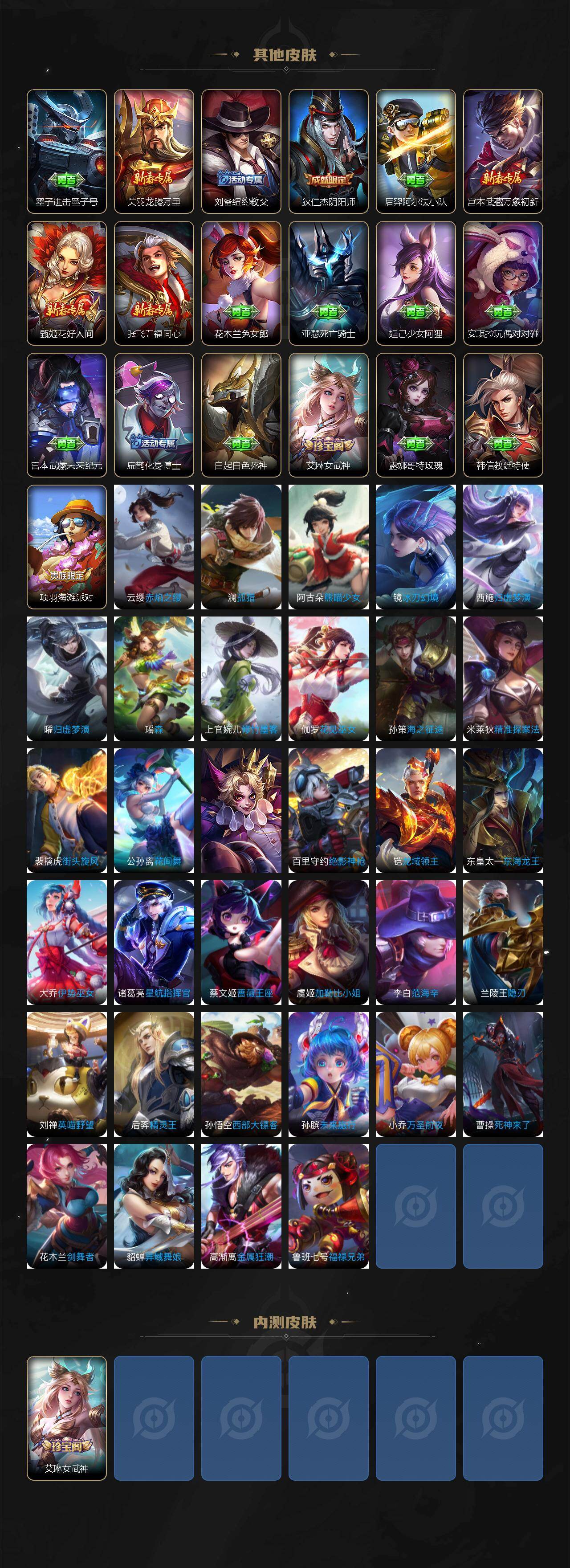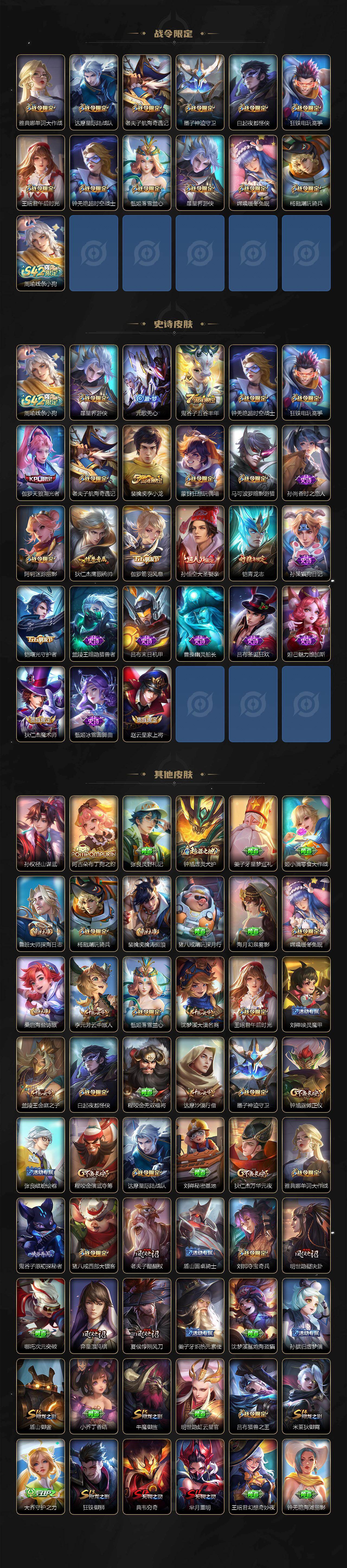 【限定皮肤】:狄仁杰阴阳师,赵云皇家上将,墨子神迹守卫,阿轲迷踪丽影,钟无艳超时空战士,白起夜都怪侠,芈月重明,吕布猎兽之王,元歌无心,夏侯惇朔风刀,甄姬落雪兰心,典韦穷奇,马可波罗暗影游猎,狄仁杰魔术师,狄仁杰万华元夜,达摩星际陆战队,达摩沙漠行僧,项羽海滩派对,老夫子醍醐杖,老夫子航海奇遇记,貂蝉遇见胡旋,程咬金演武夺筹,刘邦夺宝奇兵,王昭君午后时光,兰陵王金庭之子,孙悟空大圣娶亲,孙悟空零号赤焰,孙悟空齐天大圣,牛魔御旌,李元芳云中旅人,钟馗驱傩正仪,杨戬潮玩骑兵,雅典娜单词大作战,鬼谷子原初探秘者,鬼谷子五谷丰年,诸葛亮时雨天司,铠青龙志,弈星混沌棋,沈梦溪大漠名商,明世隐疑决卦,裴擒虎李小龙,裴擒虎擒涛扼浪,狂铁御狮,狂铁电玩高手,米莱狄御霄,伽罗天狼溯光者,伽罗炽翼辉光,盾山御銮,猪八戒西部大镖客,嫦娥暖冬兔眠,蒙犽狂想玩偶喵,鲁班大师探海日志,桑启海盐诗旅,暃星界游侠,艾琳女武神