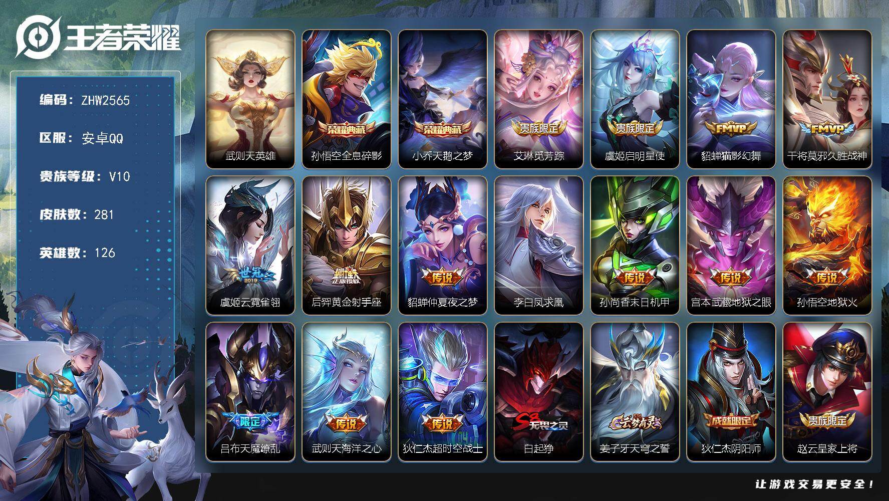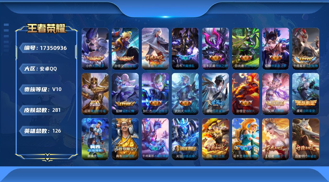 [17350936]安卓Q-V10-信用分不足禁言禁止加好友介意勿拍-126英雄-281皮肤-2典藏皮肤-1典藏英雄-14传说-71史诗 【荣耀典藏】:武则天英雄,孙悟空全息碎影,小乔天鹅之梦 【传说皮肤】:艾琳觅芳踪,虞姬启明星使,貂蝉猫影幻舞,干将莫邪久胜战神,虞姬云霓雀翎,后羿黄金射手座,貂蝉仲夏夜之梦,李白凤求凰,孙尚香末日机甲,宫本武藏地狱之眼,孙悟空地狱火,吕布天魔缭乱,武则天海洋之心,狄仁杰超时空战士 【限定皮肤】:白起狰,姜子牙天穹之誓,狄仁杰阴阳师,赵云皇家上将,嬴政白昼王子,鲁班七号狮舞东方,庄周云端筑梦师,高渐离死亡摇滚,芈月重明,吕布天魔缭乱,吕布猎兽之王,周瑜赤莲之焰,夏侯惇朔风刀,甄姬游园惊梦,曹操烛龙,曹操天狼征服者,典韦穷奇,典韦蓝屏警告,马可波罗逐梦之星,狄仁杰魔术师,狄仁杰万华元夜,项羽海滩派对,老夫子醍醐杖,关羽冰锋战神,程咬金演武夺筹,韩信逐梦之影,韩信飞衡,王昭君凤凰于飞,兰陵王驯魔猎人,兰陵王金庭之子,花木兰青春决赛季,牛魔御旌,后羿辉光之辰,李元芳银河之约,李元芳云中旅人,虞姬启明星使,钟馗神迹守卫,钟馗驱傩正仪,杨玉环遇见飞天,女娲朔望之晖,哪吒逐梦之翼,干将莫邪冰霜恋舞曲,干将莫邪胡桃夹子,雅典娜黎明之约,蔡文姬繁星吟游,太乙真人饕餮,鬼谷子原初探秘者,百里守约朱雀志,弈星混沌棋,沈梦溪星空之诺,明世隐疑决卦,裴擒虎天狼狩猎者,裴擒虎李小龙,裴擒虎擒涛扼浪,狂铁御狮,米莱狄御霄,盾山御銮,上官婉儿梁祝,鲁班大师探海日志,桑启海盐诗旅,张良古海寻踪,裴擒虎梅西,艾琳觅芳踪 【年限皮肤】:百里守约朱雀志,王昭君凤凰于飞,李白凤求凰,后羿辉光之辰,韩信飞衡 【赛季限定】:白起狰,芈月重明,夏侯惇朔风刀,曹操烛龙,典韦穷奇,狄仁杰万华元夜,老夫子醍醐杖,程咬金演武夺筹,兰陵王金庭之子,张良古海寻踪,牛魔御旌,李元芳云中旅人,钟馗驱傩正仪,雅典娜黎明之约,太乙真人饕餮,鬼谷子原初探秘者,弈星混沌棋,明世隐疑决卦,裴擒虎擒涛扼浪,狂铁御狮,米莱狄御霄,盾山御銮,鲁班大师探海日志,桑启海盐诗旅,姜子牙天穹之誓 【战令限定】:嬴政白昼王子,鲁班七号狮舞东方,吕布猎兽之王,周瑜赤莲之焰,典韦蓝屏警告,兰陵王驯魔猎人,李元芳银河之约,钟馗神迹守卫,女娲朔望之晖,沈梦溪星空之诺 【史诗皮肤】:露娜紫霞仙子,赵云皇家上将,赵云未来纪元,貂蝉圣诞恋歌,甄姬冰雪