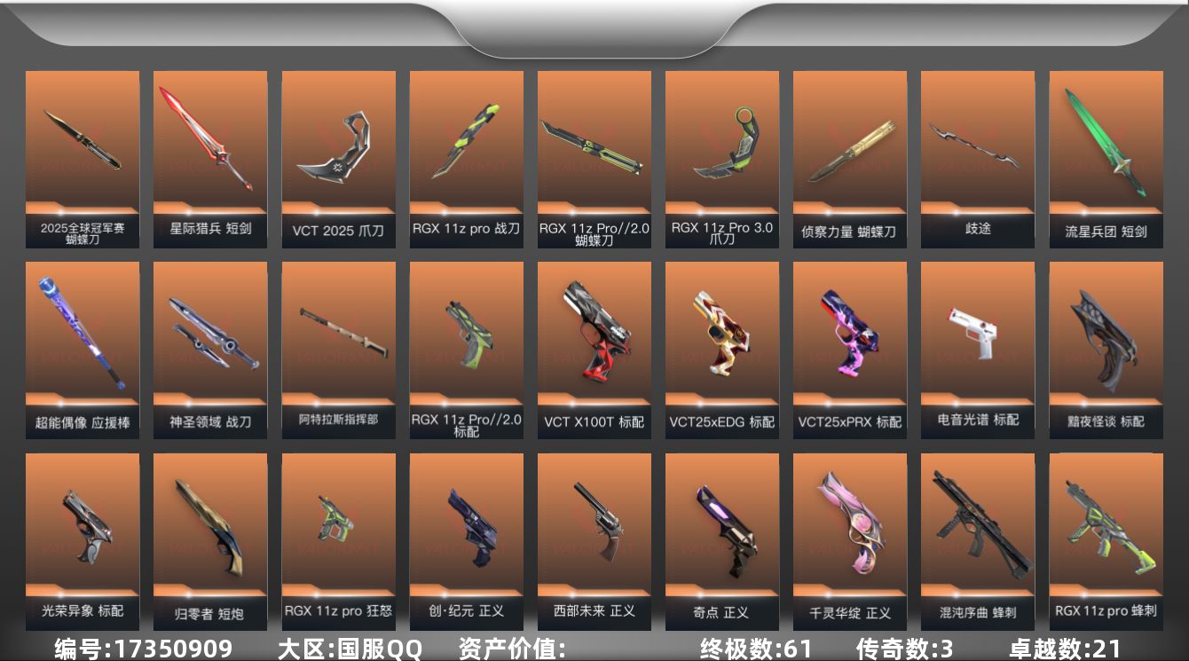 [17350909]【店主推荐捡漏号!可直接换绑】【套装】:2025全球冠军赛套装,光荣异象套装,RGX 11z Pro套装,VCT 2025 赛季套装,RGX 11z Pro//2.0套装,创·纪元套装,离火刃套装,归零者套装,神中神罚套装,离火刃套装 【英雄】:幻棱,炼狱,维斯,暮蝶,钛狐,壹决,铁臂,捷风,雷兹,幽影,不死鸟,贤者,猎枭,蝰蛇,零,芮娜,奇乐,尚勃勒,霓虹,斯凯,夜露,星礈,K/O,海神,盖可,黑梦,钢锁 【近战 武器】:近战武器-2025全球冠军赛 蝴蝶刀,近战武器-影钩,近战武器-光荣异象 歧途,近战武器-RGX 11z Pro 战刀,近战武器-神之刃,近战武器-RGX 11z Pro//2.0 蝴蝶刀,近战武器-侦察力量 蝴蝶刀,近战武器-剥皮小刀,近战武器-VCT 2025 爪刀,近战武器-紫金爪刀,近战武器-RGX 11z Pro//3.0 爪刀,近战武器-离火刃,近战武器-落英飞旋,近战武器-镭切,近战武器-鬼丸国纲,近战武器-流星兵团 短剑,近战武器-超能偶像 应援棒,近战武器-生物收割器,近战武器-神圣领域 战刀,近战武器-阿特拉斯指挥部 甩棍,近战武器-星际猎兵 短剑 【狂徒】:狂徒-艾沃莉的梦之翼,狂徒-2025全球冠军赛,狂徒-2023全球冠军赛,狂徒-归零者,狂徒-混沌序曲,狂徒-塑水宗,狂徒-创·纪元,狂徒-RGX 11z Pro,狂徒-光荣异象,狂徒-堕天遗武,狂徒-掠影,狂徒-盖亚的复仇,狂徒-海洋之星,狂徒-紫阙金琅,狂徒-超能偶像,狂徒-钢轨卫士,狂徒-弧光异彩,狂徒-流星兵团,狂徒-沙尘幻旅,狂徒-诡秘蛇影 【幻影】:幻影-源能者娱乐系统,幻影-洪荒怒焰,幻影-砰砰X特攻队,幻影-RGX 11z Pro//2.0,幻影-末日泡泡,幻影-天界神兵//2.0,幻影-神中神罚,幻影-超限闪存,幻影-合金战车,幻影-神圣领域,幻影-聚合之力,幻影-战术小伙伴 【戍卫】:戍卫-破败军械,戍卫-RGX 11z Pro,戍卫-天界神兵,戍卫-超能偶像,戍卫-钢轨卫士,戍卫-彩梦之城,戍卫-浮光跃金,戍卫-花漾粉红,戍卫-萌彩剪影,戍卫-战术熊与伙伴们,戍卫-月球哨兵,戍卫-折光棱晶 【獠犬】:獠犬-归零者,獠犬-弧光异彩,獠犬-神圣领域,獠犬-采蜜小蜂队,獠犬-胡桃狂想,獠犬-模拟赫兹,獠犬-数码咒术,獠犬-战术小伙伴 【冥驹】:冥驹-归零