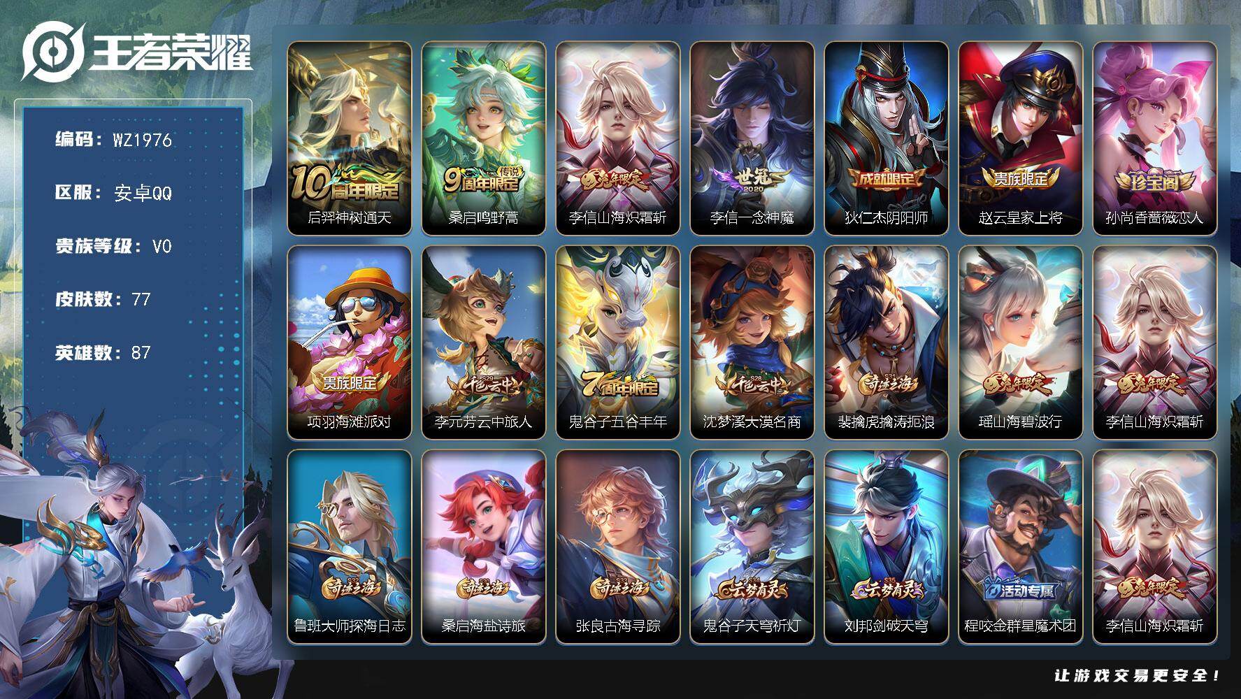 [17351345]安卓Q-77皮肤-4传说-14史诗 【传说皮肤】:后羿神树通天,桑启鸣野蒿,李信山海炽霜斩,李信一念神魔 【限定皮肤】:狄仁杰阴阳师,赵云皇家上将,孙尚香蔷薇恋人,项羽海滩派对,李元芳云中旅人,鬼谷子五谷丰年,沈梦溪大漠名商,裴擒虎擒涛扼浪,瑶山海碧波行,李信山海炽霜斩,鲁班大师探海日志,桑启海盐诗旅,张良古海寻踪,鬼谷子天穹祈灯,刘邦剑破天穹,程咬金群星魔术团 【年限皮肤】:李信山海炽霜斩,瑶山海碧波行 【赛季限定】:沈梦溪大漠名商,李元芳云中旅人,桑启海盐诗旅,裴擒虎擒涛扼浪,鲁班大师探海日志,张良古海寻踪,鬼谷子天穹祈灯,刘邦剑破天穹 【史诗皮肤】:刘禅电玩爆裂旋风,瑶山海碧波行,鬼谷子五谷丰年,孙策猫狗日记,张飞乱世虎臣,吕布圣诞狂欢,妲己魅力维加斯,嬴政摇滚巨星,孙尚香水果甜心,孙尚香蔷薇恋人,宫本武藏鬼剑武藏,王昭君偶像歌手,赵云未来纪元,赵云皇家上将 【其他皮肤】:小乔秘证寻踪,东皇太一金福满堂,米莱狄怪诞之夜,亚瑟动物派对,程咬金群星魔术团,刘邦剑破天穹,鬼谷子天穹祈灯,程咬金暖冬絮语,张良古海寻踪,李元芳妄想特派,姬小满零食大作战,鲁班大师探海日志,莱西奥西部游侠,裴擒虎擒涛扼浪,白起乐园追猎者,牛魔牛运亨通,猪八戒潮玩探月行,海月幻泉雾影,桑启海盐诗旅,李元芳云中旅人,沈梦溪大漠名商,鲁班大师乓乓大师,张良缤纷绘卷,刘禅秘密基地,盾山圆桌骑士,吕布野性能量,大乔守护之力,苏烈坚韧之力,孙尚香沉稳之力,狄仁杰阴阳师,刘备万事如意,张飞五福同心,花木兰兔女郎,亚瑟死亡骑士,典韦黄金武士,孙膑天使之翼,韩信教廷特使,项羽海滩派对,澜孤猎,曜归虚梦演,云中君荷鲁斯之眼,瑶森,盘古创世神祝,上官婉儿修竹墨客,李信灼热之刃,孙策海之征途,明世隐占星师,百里守约绝影神枪,铠龙域领主,干将莫邪第七人偶,大乔伊势巫女,杨戬埃及法老,马可波罗激情绿茵,蔡文姬蔷薇王座,刘禅英喵野望,孙悟空西部大镖客,貂蝉异域舞娘,露娜绯红之刃,鲁班七号福禄兄弟 【内测皮肤】:孙尚香蔷薇恋人 【营地ID】:1785740426