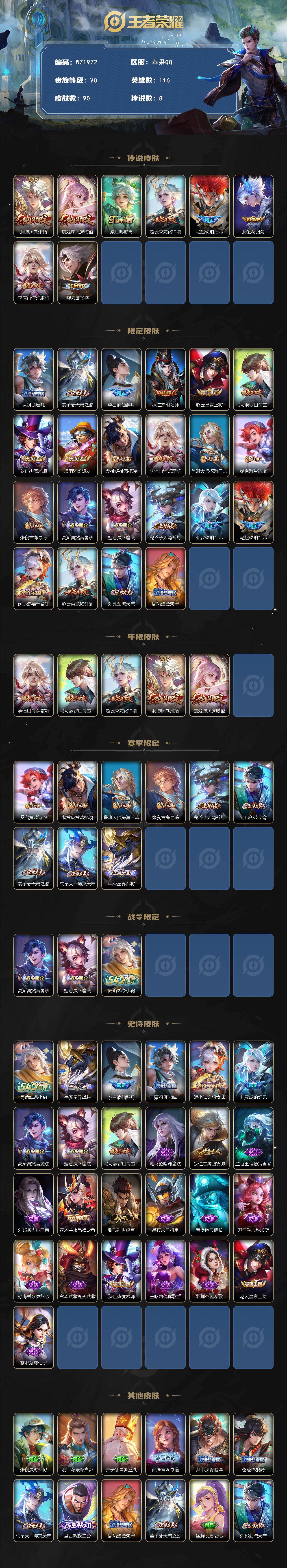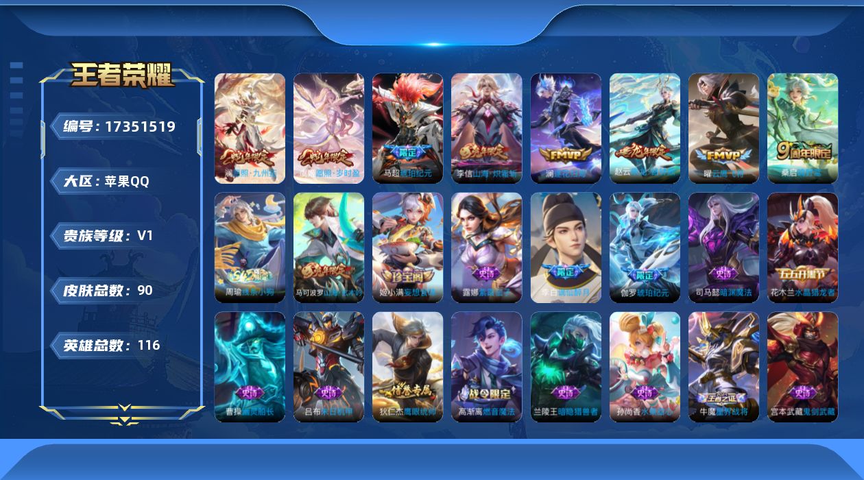 [17351519]苹果Q-90皮肤-8传说-23史诗 【英雄全皮】:敖隐全皮 【传说皮肤】:澜愿照九州拓,虞姬愿照岁时盈,桑启鸣野蒿,赵云乘龙铭钟鼎,马超琥珀纪元,澜逐花归海,李信山海炽霜斩,曜云鹰飞将 【限定皮肤】:蒙犽顽岩魄,姜子牙天穹之誓,李白谪仙醉月,狄仁杰阴阳师,赵云皇家上将,马可波罗山海玄木吟,狄仁杰魔术师,项羽海滩派对,裴擒虎擒涛扼浪,李信山海炽霜斩,鲁班大师探海日志,桑启海盐诗旅,张良古海寻踪,高渐离燃音魔法,妲己灵卜魔法,鬼谷子天穹祈灯,伽罗琥珀纪元,马超琥珀纪元,姬小满妄想食味,赵云乘龙铭钟鼎,刘邦剑破天穹,周瑜熔金海岸 【年限皮肤】:李信山海炽霜斩,马可波罗山海玄木吟,赵云乘龙铭钟鼎,澜愿照九州拓,虞姬愿照岁时盈 【赛季限定】:桑启海盐诗旅,裴擒虎擒涛扼浪,鲁班大师探海日志,张良古海寻踪,鬼谷子天穹祈灯,刘邦剑破天穹,姜子牙天穹之誓,东皇太一噬灭天穹,牛魔星界战将 【战令限定】:高渐离燃音魔法,妲己灵卜魔法,周瑜线条小狗 【史诗皮肤】:周瑜线条小狗,牛魔星界战将,李白谪仙醉月,蒙犽顽岩魄,姬小满妄想食味,伽罗琥珀纪元,高渐离燃音魔法,妲己灵卜魔法,马可波罗山海玄木吟,司马懿暗渊魔法,狄仁杰鹰眼统帅,兰陵王暗隐猎兽者,刘邦德古拉伯爵,花木兰水晶猎龙者,张飞乱世虎臣,吕布末日机甲,曹操幽灵船长,妲己魅力维加斯,孙尚香水果甜心,宫本武藏鬼剑武藏,狄仁杰魔术师,王昭君偶像歌手,貂蝉圣诞恋歌,赵云皇家上将,露娜紫霞仙子 【其他皮肤】:张良灵野札记,明世隐景韶洛都,姜子牙星梦巡礼,西施雪境奇遇,典韦铁骨偃魂,苍苍林狼骑,东皇太一噬灭天穹,盘古敬我三分,周瑜熔金海岸,姜子牙天穹之誓,貂蝉长夏之忆,刘邦剑破天穹,嫦娥漠中幻影,海诺时空谍影,妲己灵卜魔法,鬼谷子天穹祈灯,张良古海寻踪,鲁班大师探海日志,裴擒虎擒涛扼浪,桑启海盐诗旅,蒙恬蔚蓝守将,鲁班大师乓乓大师,狂铁特工战影,李白敏锐之力,诸葛亮掌控之力,老夫子功夫老勺,关羽龙腾万里,刘备纽约教父,狄仁杰阴阳师,后羿阿尔法小队,张飞五福同心,花木兰兔女郎,亚瑟死亡骑士,典韦黄金武士,宫本武藏未来纪元,扁鹊救世之瞳,武则天东方不败,白起白色死神,赵云忍炎影,赵云白执事,达摩大发明家,韩信街头霸王,韩信教廷特使,项羽海滩派对,暃碧珀绯影,司空震启蛰,蒙犽归虚梦演,曜归虚梦演,元歌午夜歌剧院,裴擒虎街头旋风,百里玄策威尼斯狂欢,铠龙