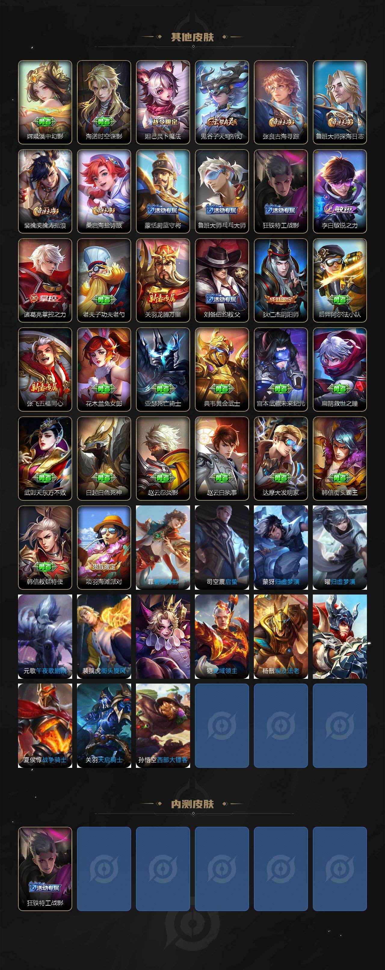 【其他皮肤】:张良灵野札记,明世隐景韶洛都,姜子牙星梦巡礼,西施雪境奇遇,典韦铁骨偃魂,苍苍林狼骑,东皇太一噬灭天穹,盘古敬我三分,周瑜熔金海岸,姜子牙天穹之誓,貂蝉长夏之忆,刘邦剑破天穹,嫦娥漠中幻影,海诺时空谍影,妲己灵卜魔法,鬼谷子天穹祈灯,张良古海寻踪,鲁班大师探海日志,裴擒虎擒涛扼浪,桑启海盐诗旅,蒙恬蔚蓝守将,鲁班大师乓乓大师,狂铁特工战影,李白敏锐之力,诸葛亮掌控之力,老夫子功夫老勺,关羽龙腾万里,刘备纽约教父,狄仁杰阴阳师,后羿阿尔法小队,张飞五福同心,花木兰兔女郎,亚瑟死亡骑士,典韦黄金武士,宫本武藏未来纪元,扁鹊救世之瞳,武则天东方不败,白起白色死神,赵云忍炎影,赵云白执事,达摩大发明家,韩信街头霸王,韩信教廷特使,项羽海滩派对,暃碧珀绯影,司空震启蛰,蒙犽归虚梦演,曜归虚梦演,元歌午夜歌剧院,裴擒虎街头旋风,百里玄策威尼斯狂欢,铠龙