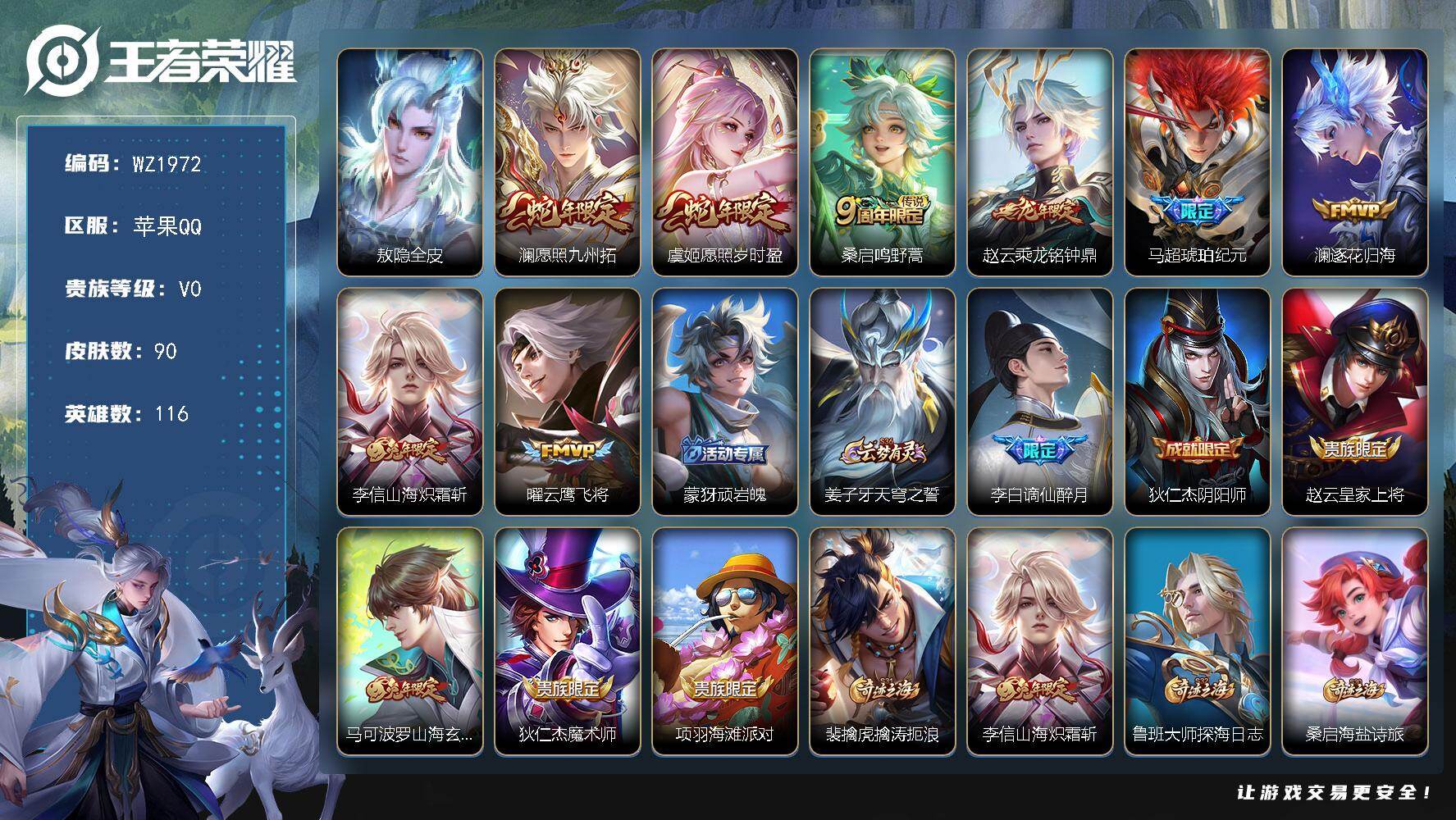 - [16410440]【店主推荐捡漏号!可直接换绑】苹果Q-V5-永恒钻石IV段位-117英雄-88皮肤-1典藏皮肤-1传说-23史诗 【荣耀典藏】:铠银白咏叹调 【传说皮肤】:后羿神树通天 【限定皮肤】:姜子牙天穹之誓,杨戬破阵退雄兵,狄仁杰阴阳师,赵云皇家上将,芈月幻夜卜梦,达摩沙漠行僧,项羽海滩派对,兰陵王金庭之子,李元芳匿光侦查者,李元芳云中旅人,黄忠火炮绅士,梦奇顽趣,沈梦溪大漠名商,裴擒虎李小龙,裴擒虎擒涛扼浪,鲁班大师探海日志,桑启海盐诗旅,张良古海寻踪,蒙犽百解令,刘邦剑破天穹,镜青焰无极,项羽苍威无极,刘备异域游侠,周瑜熔金海岸 【赛季限定】:达摩沙漠行僧,兰陵王金庭之子,张良古海寻踪,李元芳云中旅人,梦奇顽趣,沈梦溪大漠名商,裴擒虎擒涛扼浪,鲁班大师探海日志,桑启海盐诗旅,刘邦剑破天穹,姜子牙天穹之誓 【战令限定】:芈月幻夜卜梦,黄忠火炮绅士,镜青焰无极,项羽苍威无极 【史诗皮肤】:赵云皇家上将,廉颇地狱岩魂,宫本武藏鬼剑武藏,孙尚香水果甜心,妲己魅力维加斯,吕布圣诞狂欢,曹操幽灵船长,李白千年之狐,张飞乱世虎臣,李元芳逐浪之夏,白起星夜王子,孙策猫狗日记,狄仁杰鹰眼统帅,娜可露露晚萤,孙尚香时之恋人,裴擒虎李小龙,黄忠火炮绅士,澜赏金猎手,梦奇顽趣,李元芳匿光侦查者,蒙犽百解令,镜青焰无极,狂铁龙之律动 【其他皮肤】:项羽海滩派对,韩信教廷特使,赵云白执事,赵云忍炎影,芈月红桃皇后,亚瑟死亡骑士,达摩拳王,花木兰兔女郎,张飞五福同心,狄仁杰阴阳师,关羽龙腾万里,老夫子功夫老勺,孙尚香沉稳之力,李白敏锐之力,小乔丁香结,沈梦溪鲨炮海盗猫,狂铁特工战影,达摩沙漠行僧,芈月幻夜卜梦,兰陵王金庭之子,刘禅唤灵魔甲,沈梦溪大漠名商,李元芳云中旅人,刘备潮玩造梦师,桑启海盐诗旅,猪八戒潮玩探月行,白起乐园追猎者,裴擒虎擒涛扼浪,鲁班大师探海日志,张良古海寻踪,后羿完美运算,刘邦剑破天穹,项羽苍威无极,大司命暗都幽影,刘备异域游侠,杨戬破阵退雄兵,姜子牙天穹之誓,周瑜熔金海岸,露娜命运加冕,姬小满小满鸭,白起死霸装,亚瑟荣光之誓,艾琳鹤鸣心笺,鲁班七号福禄兄弟,高渐离金属狂潮,花木兰剑舞者,曹操超能战警,小乔万圣前夜,刘禅英喵野望,关羽天启骑士,蔡文姬蔷薇王座,诸葛亮星航指挥官,干将莫邪第七人偶,百里玄策威尼斯狂欢,公孙离花间舞,弈星踏雪寻梅,上官婉儿修竹墨客,马超幸存者,镜冰