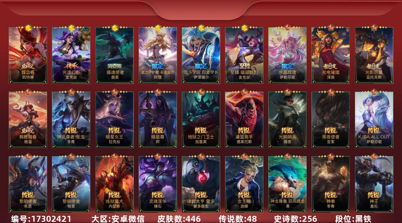[17302421]有二次!7.2w收藏!437皮肤6神话48传说256史诗!2紫色纹章! 收集:心心相印 源计划 山海绘卷 秩序对决混沌 战斗学院启程 玉兔呈祥 神话:光谱幻影 摄魂使者 至臻喵喵魅影 白金EZ 蝶恋春,星之守护者 永绽盛芒 阿狸,光谱幻影 金克丝,摄魂使者 薇恩,至臻 喵喵魅影 金克丝,蝶恋春 凯特琳,战斗学院 白金学长 伊泽瑞尔,星之守护者 陨 洛,炼狱魔犬 内瑟斯,西部魔影 大小姐 蕾欧娜,魔女 伊芙琳,光电璀璨 泽丽,光影巨翼 亚托克斯,源计划:毁灭 派克,水晶玫瑰 萨勒芬妮,灵魂莲华 阿狸,灵魂莲华 瑟提,地狱之门卫士 加里奥,灵魂莲华 锤石,星之守护者 卡莎,心之钢 凯隐,星域武神 贾克斯,黎明使者 锐雯,女主播 迦娜,斗魂无双 亚索,黎明使者 永恩,跳跳倩影 厄运小姐,霸天零式 赛恩,源计划:联合 艾希,星之守护者 金克丝,星之守护者 落 霞,驯龙炮手 崔丝塔娜,光明哨兵 薇恩,月蚀骑士 蕾欧娜,暗星女王 拉克丝,暗星尊 烬,西部天使 艾希,源计划:泯灭 雷克顿,源计划:林 易,神拳 李青,黑夜使者 亚索,剪胜裁春 格温,律政大亨 蒙多医生,天煞 劫,神王 盖伦,神王 德莱厄斯,战斗学院 伊泽瑞尔,星域游侠 崔斯特,源计划:净化 薇恩,K/DA ALL OUT 萨勒芬妮,灌篮高手 德莱厄斯,西部魔影 卢锡安,神龙尊者 驭风啸龙 易,西部天使 赛娜,海魔至尊 亚托克斯,神龙尊者 圣龙 李青,星之守护者 阿狸
